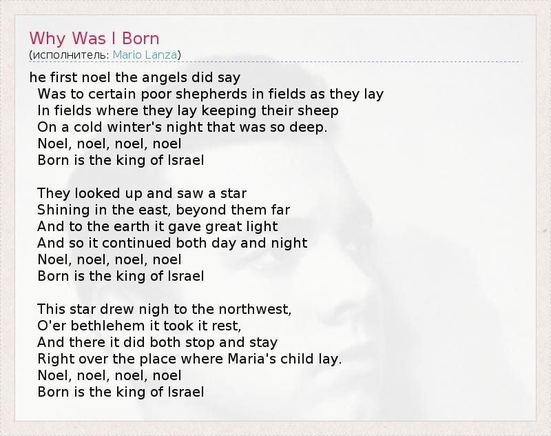 he first noel the angels did say Was to certain poor shepherds in fields as they lay In fields where they lay keeping their sheep On a cold winter's night that was so deep. Noel, noel, noel, noel Born is the king of Israel They looked up and saw a star Shining in the east, beyond them far And to the earth it gave great light And so it continued both day and night Noel, noel, noel, noel Born is the king of Israel This star drew nigh to the northwest, O'er bethlehem it took it rest, And there it did both stop and stay Right over the place where Maria's child lay. Noel, noel, noel, noel Born is the king of Israel