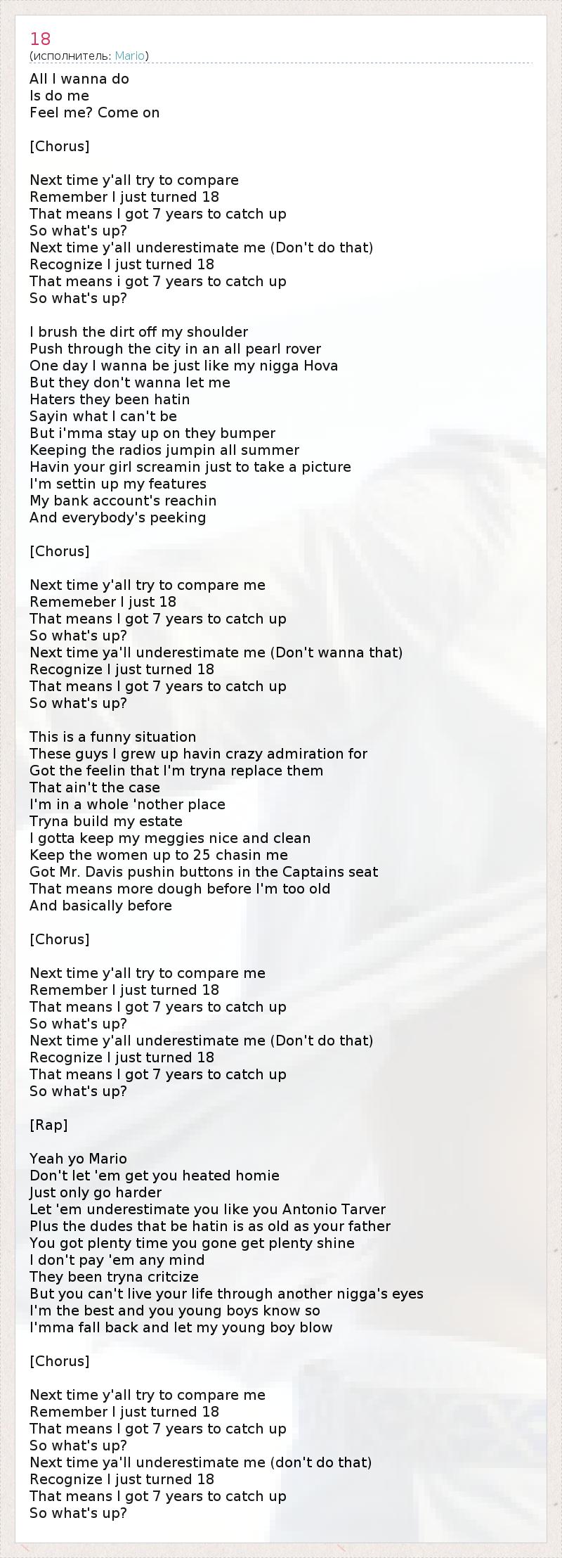 Это интересно:Mario Dewar Barrett родился 27.08.86 года в Балтиморе, уже прославившим себя группой Dru Hill. В детстве мама купила Марио караоке и пианино, благодаря чему он стал развивать свой слух и голос."Мама услышала, как я пою и сначала подумала, что это просто громко играющее радио, но она была шокирована, когда узнала что это я" Как и тысячи подобных артистов, Марио начал с конкурсов талантов местного... продолжение