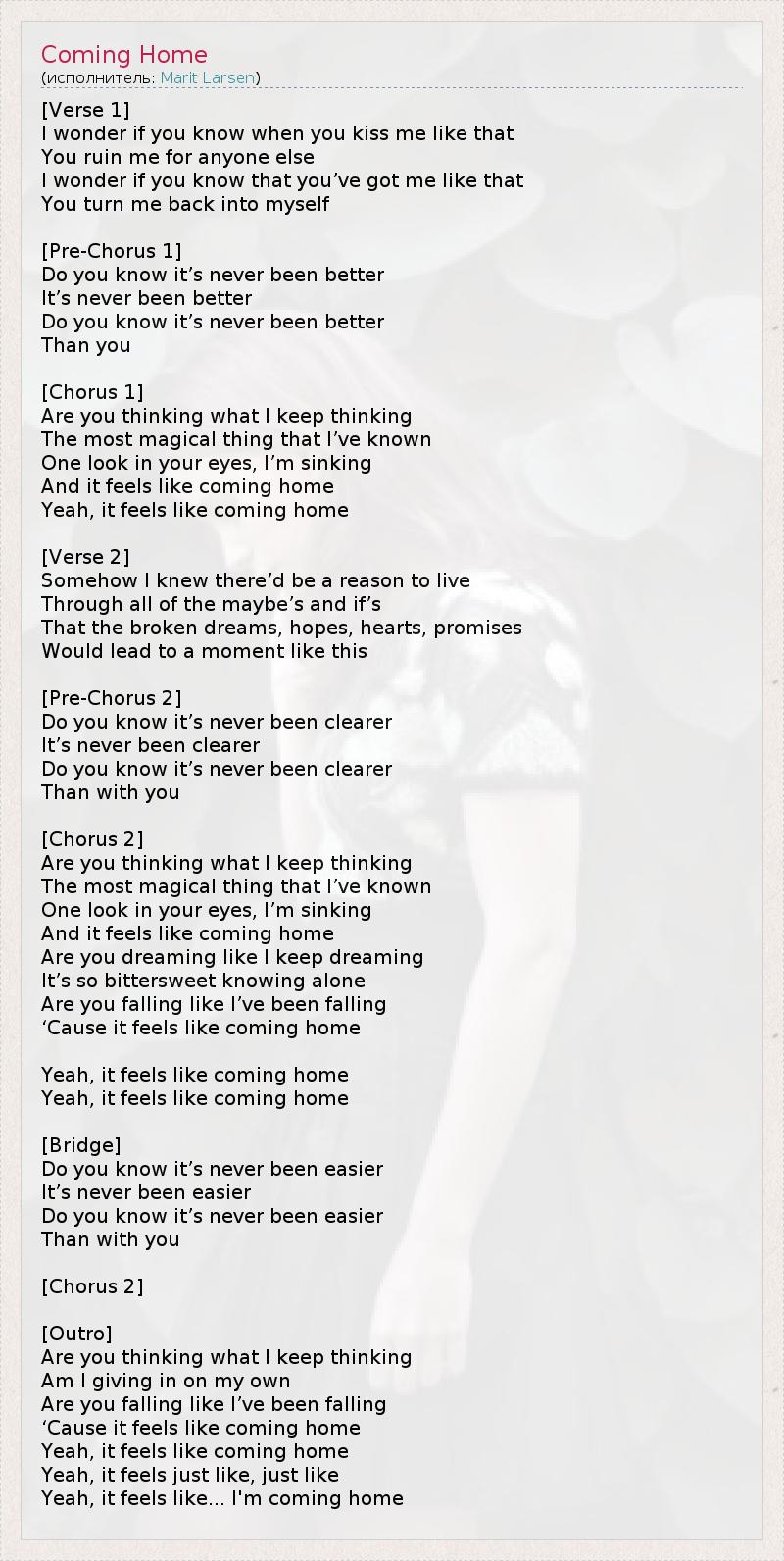 [Verse 1] I wonder if you know when you kiss me like that You ruin me for anyone else I wonder if you know that you’ve got me like that You turn me back into myself [Pre-Chorus 1] Do you know it’s never been better It’s never been better Do you know it’s never been better Than you [Chorus 1] Are you thinking what I keep thinking The most magical thing that I’ve known One look in your eyes, I’m sinking And it feels like coming home Yeah, it feels like coming home [Verse 2] Somehow I knew there’d be a reason to live Through all of the maybe’s and if’s That the broken dreams, hopes, hearts, promises Would lead to a moment like this [Pre-Chorus 2] Do you know it’s never been clearer It’s never been clearer Do you know it’s never been clearer Than with you [Chorus 2] Are you thinking what I keep thinking The most magical thing that I’ve known One look in your eyes, I’m sinking And it feels like coming home Are you dreaming like I keep dreaming It’s so bittersweet knowing alone Are you falling like I’ve been falling ‘Cause it feels like coming home Yeah, it feels like coming home Yeah, it feels like coming home [Bridge] Do you know it’s never been easier It’s never been easier Do you know it’s never been easier Than with you [Chorus 2] [Outro] Are you thinking what I keep thinking Am I giving in on my own Are you falling like I’ve been falling ‘Cause it feels like coming home Yeah, it feels like coming home Yeah, it feels just like, just like Yeah, it feels like... I'm coming home