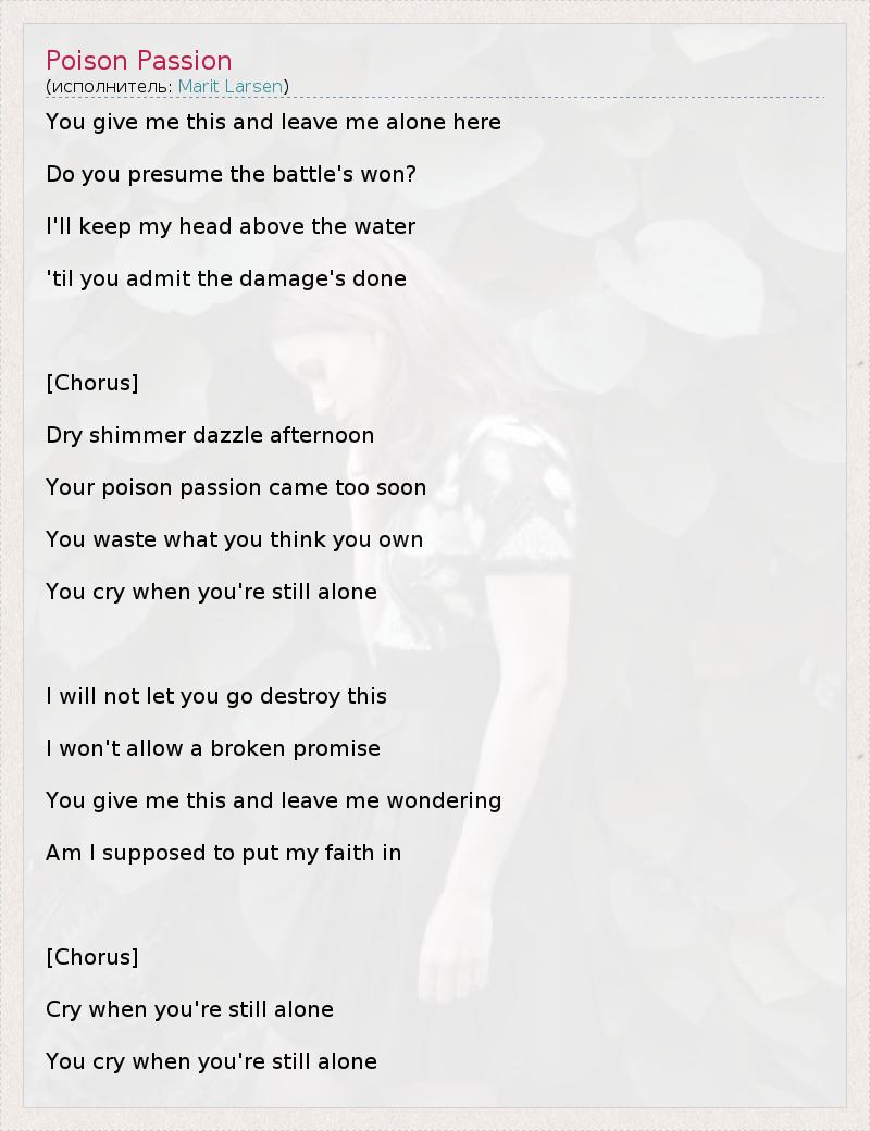 You give me this and leave me alone here Do you presume the battle's won? I'll keep my head above the water 'til you admit the damage's done [Chorus] Dry shimmer dazzle afternoon Your poison passion came too soon You waste what you think you own You cry when you're still alone I will not let you go destroy this I won't allow a broken promise You give me this and leave me wondering Am I supposed to put my faith in [Chorus] Cry when you're still alone You cry when you're still alone