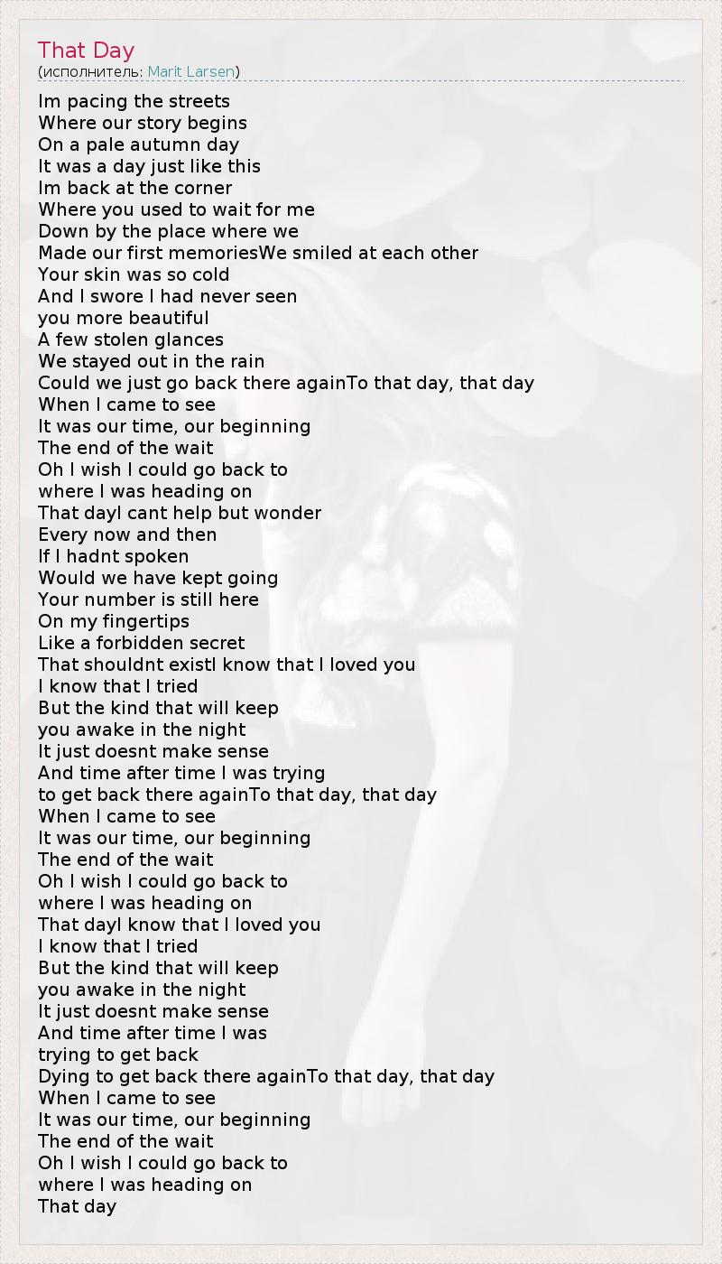 Im pacing the streets Where our story begins On a pale autumn day It was a day just like this Im back at the corner Where you used to wait for me Down by the place where we Made our first memoriesWe smiled at each other Your skin was so cold And I swore I had never seen you more beautiful A few stolen glances We stayed out in the rain Could we just go back there againTo that day, that day When I came to see It was our time, our beginning The end of the wait Oh I wish I could go back to where I was heading on That dayI cant help but wonder Every now and then If I hadnt spoken Would we have kept going Your number is still here On my fingertips Like a forbidden secret That shouldnt existI know that I loved you I know that I tried But the kind that will keep you awake in the night It just doesnt make sense And time after time I was trying to get back there againTo that day, that day When I came to see It was our time, our beginning The end of the wait Oh I wish I could go back to where I was heading on That dayI know that I loved you I know that I tried But the kind that will keep you awake in the night It just doesnt make sense And time after time I was trying to get back Dying to get back there againTo that day, that day When I came to see It was our time, our beginning The end of the wait Oh I wish I could go back to where I was heading on That day