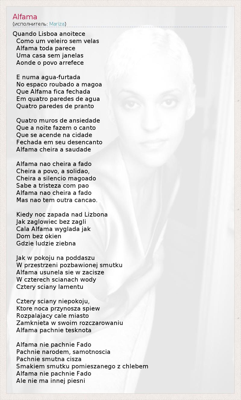Quando Lisboa anoitece Como um veleiro sem velas Alfama toda parece Uma casa sem janelas Aonde o povo arrefece E numa agua-furtada No espaco roubado a magoa Que Alfama fica fechada Em quatro paredes de agua Quatro paredes de pranto Quatro muros de ansiedade Que a noite fazem o canto Que se acende na cidade Fechada em seu desencanto Alfama cheira a saudade Alfama nao cheira a fado Cheira a povo, a solidao, Cheira a silencio magoado Sabe a tristeza com pao Alfama nao cheira a fado Mas nao tem outra cancao. Kiedy noc zapada nad Lizbona Jak zaglowiec bez zagli Cala Alfama wyglada jak Dom bez okien Gdzie ludzie ziebna Jak w pokoju na poddaszu W przestrzeni pozbawionej smutku Alfama usunela sie w zacisze W czterech scianach wody Cztery sciany lamentu Cztery sciany niepokoju, Ktore noca przynosza spiew Rozpalajacy cale miasto Zamknieta w swoim rozczarowaniu Alfama pachnie tesknota Alfama nie pachnie Fado Pachnie narodem, samotnoscia Pachnie smutna cisza Smakiem smutku pomieszanego z chlebem Alfama nie pachnie Fado Ale nie ma innej piesni
