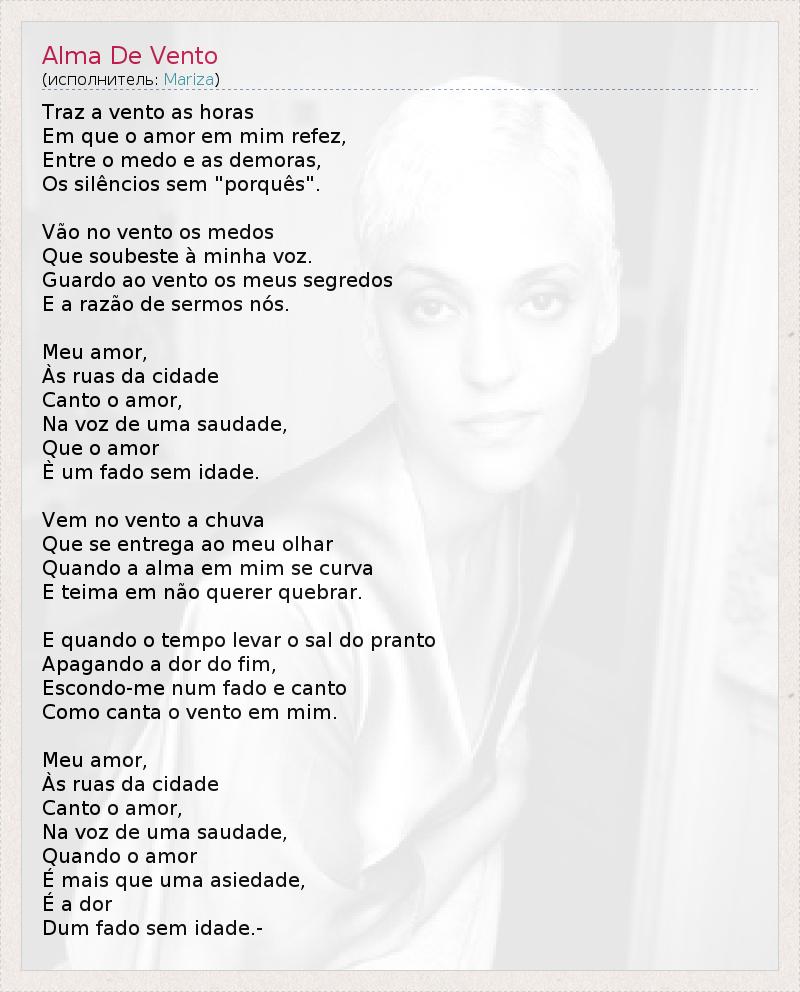 Traz a vento as horas Em que o amor em mim refez, Entre o medo e as demoras, Os silêncios sem "porquês". Vão no vento os medos Que soubeste à minha voz. Guardo ao vento os meus segredos E a razão de sermos nós. Meu amor, Às ruas da cidade Canto o amor, Na voz de uma saudade, Que o amor È um fado sem idade. Vem no vento a chuva Que se entrega ao meu olhar Quando a alma em mim se curva E teima em não querer quebrar. E quando o tempo levar o sal do pranto Apagando a dor do fim, Escondo-me num fado e canto Como canta o vento em mim. Meu amor, Às ruas da cidade Canto o amor, Na voz de uma saudade, Quando o amor É mais que uma asiedade, É a dor Dum fado sem idade.-