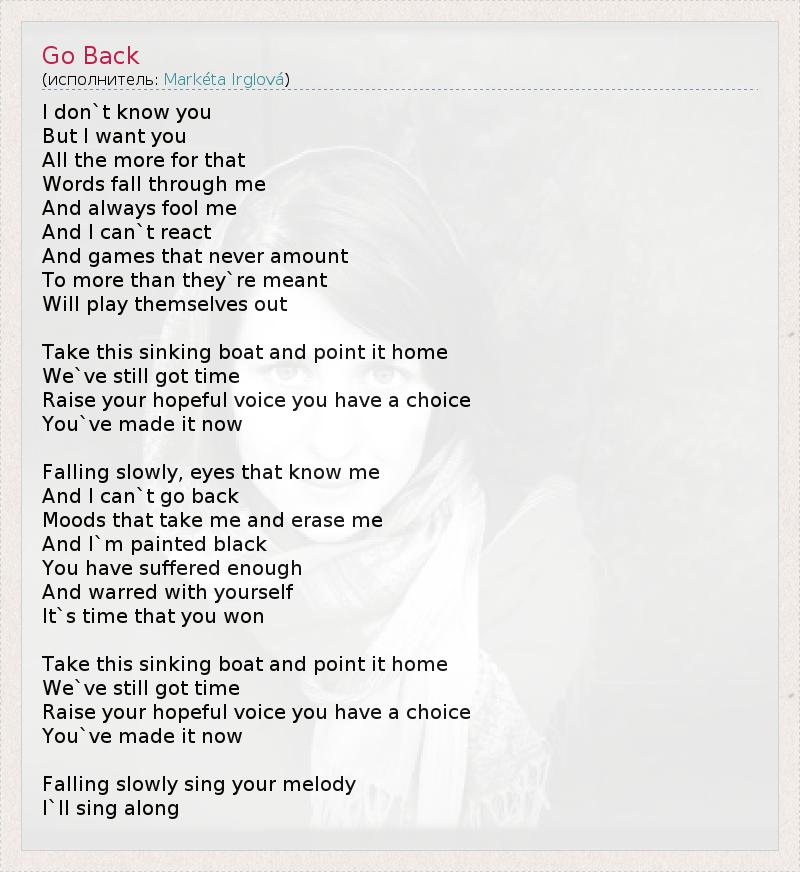 I don`t know you But I want you All the more for that Words fall through me And always fool me And I can`t react And games that never amount To more than they`re meant Will play themselves out Take this sinking boat and point it home We`ve still got time Raise your hopeful voice you have a choice You`ve made it now Falling slowly, eyes that know me And I can`t go back Moods that take me and erase me And I`m painted black You have suffered enough And warred with yourself It`s time that you won Take this sinking boat and point it home We`ve still got time Raise your hopeful voice you have a choice You`ve made it now Falling slowly sing your melody I`ll sing along