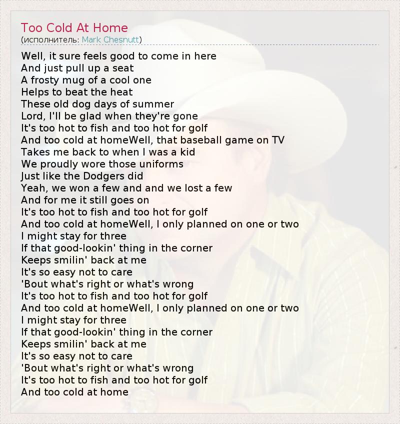 Well, it sure feels good to come in here And just pull up a seat A frosty mug of a cool one Helps to beat the heat These old dog days of summer Lord, I'll be glad when they're gone It's too hot to fish and too hot for golf And too cold at homeWell, that baseball game on TV Takes me back to when I was a kid We proudly wore those uniforms Just like the Dodgers did Yeah, we won a few and and we lost a few And for me it still goes on It's too hot to fish and too hot for golf And too cold at homeWell, I only planned on one or two I might stay for three If that good-lookin' thing in the corner Keeps smilin' back at me It's so easy not to care 'Bout what's right or what's wrong It's too hot to fish and too hot for golf And too cold at homeWell, I only planned on one or two I might stay for three If that good-lookin' thing in the corner Keeps smilin' back at me It's so easy not to care 'Bout what's right or what's wrong It's too hot to fish and too hot for golf And too cold at home