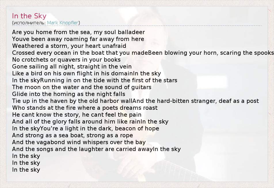 Это интересно:Сэр Марк Фро́йдер Но́пфлер (англ. Mark Freuder Knopfler, род. 12 августа 1949, Глазго, Шотландия) — британский рок-музыкант, певец и композитор, один из сооснователей группы Dire Straits. Его вокал лучше всего описывается немецким термином Sprechgesang — не совсем пение, но и не разговор. Он использует гитару так, как будто она является его вторым «голосом».Наибольшую популярность приобрёл в качестве автора... продолжение