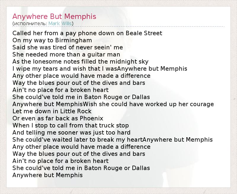 Called her from a pay phone down on Beale Street On my way to Birmingham Said she was tired of never seein' me She needed more than a guitar man As the lonesome notes filled the midnight sky I wipe my tears and wish that I wasAnywhere but Memphis Any other place would have made a difference Way the blues pour out of the dives and bars Ain't no place for a broken heart She could've told me in Baton Rouge or Dallas Anywhere but MemphisWish she could have worked up her courage Let me down in Little Rock Or even as far back as Phoenix When I stop to call from that truck stop And telling me sooner was just too hard She could've waited later to break my heartAnywhere but Memphis Any other place would have made a difference Way the blues pour out of the dives and bars Ain't no place for a broken heart She could've told me in Baton Rouge or Dallas Anywhere but Memphis