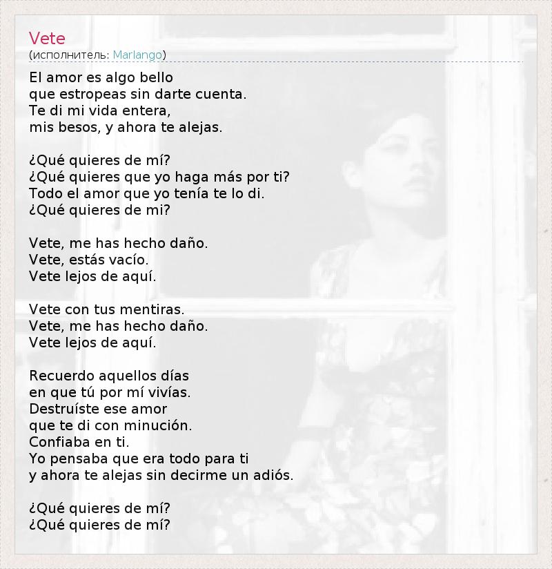 El Amor ES Algo Bello Que estropeas грех darte Cuenta . Те ди ми вида Entera , MIS Besos , у Ahora те Алеяс . ¿ Qué Quieres де Mi? ¿ Qué Quieres Que лет Хага más POR ти ? Todo El Amor Que лет Tenia те вот DI. ¿ Qué Quieres де ми ? Vete , мне есть Hecho Дано . Vete , Estas vacío . Vete Lejos де aquí . Веете против Тус Mentiras . Vete , мне есть Hecho Дано . Vete Lejos де aquí . Recuerdo aquellos días ан Que tú POR mí vivías . Destruíste ESE Amor Que те ди кон minución . Confiaba Эн Ти . Йо pensaba Que эра TODO пункт Ti у Ahora те Алеяс грех decirme Звучит прощай . ¿ Qué Quieres де Mi? ¿ Qué Quieres де Mi?
