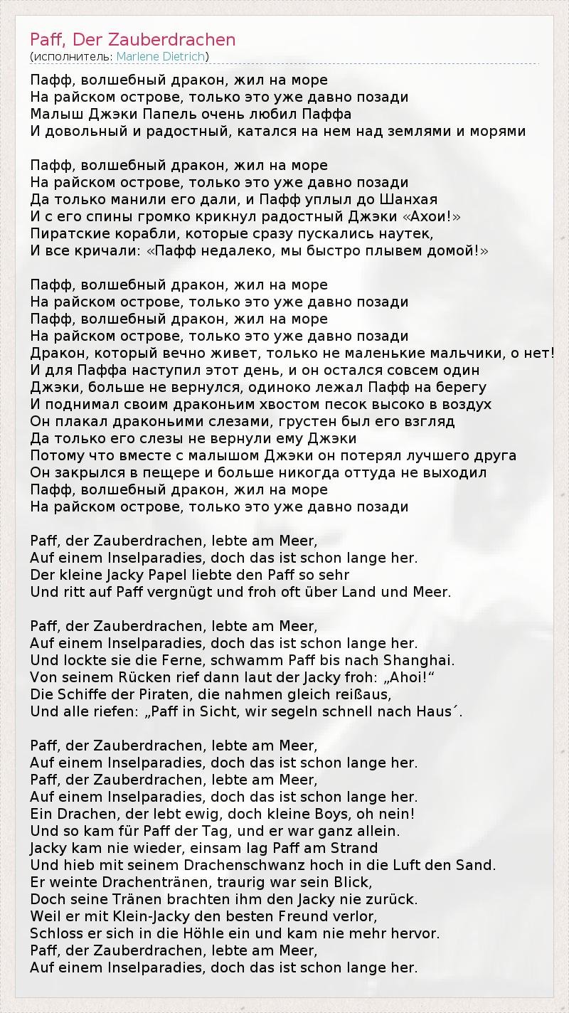 Пафф, волшебный дракон, жил на море На райском острове, только это уже давно позади Малыш Джэки Папель очень любил Паффа И довольный и радостный, катался на нем над землями и морями Пафф, волшебный дракон, жил на море На райском острове, только это уже давно позади Да только манили его дали, и Пафф уплыл до Шанхая И с его спины громко крикнул радостный Джэки «Ахои!» Пиратские корабли, которые сразу пускались наутек, И все кричали: «Пафф недалеко, мы быстро плывем домой!» Пафф, волшебный дракон, жил на море На райском острове, только это уже давно позади Пафф, волшебный дракон, жил на море На райском острове, только это уже давно позади Дракон, который вечно живет, только не маленькие мальчики, о нет! И для Паффа наступил этот день, и он остался совсем один Джэки, больше не вернулся, одиноко лежал Пафф на берегу И поднимал своим драконьим хвостом песок высоко в воздух Он плакал драконьими слезами, грустен был его взгляд Да только его слезы не вернули ему Джэки Потому что вместе с малышом Джэки он потерял лучшего друга Он закрылся в пещере и больше никогда оттуда не выходил Пафф, волшебный дракон, жил на море На райском острове, только это уже давно позади Paff, der Zauberdrachen, lebte am Meer, Auf einem Inselparadies, doch das ist schon lange her. Der kleine Jacky Papel liebte den Paff so sehr Und ritt auf Paff vergnügt und froh oft über Land und Meer. Paff, der Zauberdrachen, lebte am Meer, Auf einem Inselparadies, doch das ist schon lange her. Und lockte sie die Ferne, schwamm Paff bis nach Shanghai. Von seinem Rücken rief dann laut der Jacky froh: „Ahoi!“ Die Schiffe der Piraten, die nahmen gleich reißaus, Und alle riefen: „Paff in Sicht, wir segeln schnell nach Haus´. Paff, der Zauberdrachen, lebte am Meer, Auf einem Inselparadies, doch das ist schon lange her. Paff, der Zauberdrachen, lebte am Meer, Auf einem Inselparadies, doch das ist schon lange her. Ein Drachen, der lebt ewig, doch kleine Boys, oh nein! Und so kam für Paff der Tag, und er war ganz allein. Jacky kam nie wieder, einsam lag Paff am Strand Und hieb mit seinem Drachenschwanz hoch in die Luft den Sand. Er weinte Drachentränen, traurig war sein Blick, Doch seine Tränen brachten ihm den Jacky nie zurück. Weil er mit Klein-Jacky den besten Freund verlor, Schloss er sich in die Höhle ein und kam nie mehr hervor. Paff, der Zauberdrachen, lebte am Meer, Auf einem Inselparadies, doch das ist schon lange her.