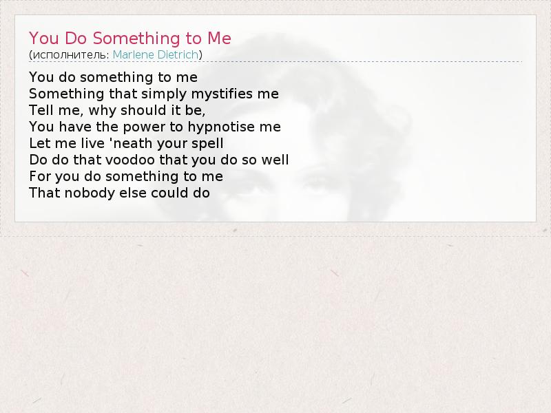 You do something to me Something that simply mystifies me Tell me, why should it be, You have the power to hypnotise me Let me live 'neath your spell Do do that voodoo that you do so well For you do something to me That nobody else could do