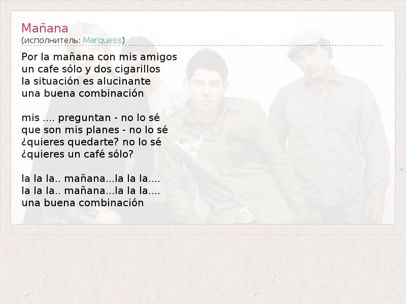 Это интересно:Marquess - это испанская поп-группа. Группа была образована в 2006 году 4-мя музыкантами. Летом 2006 года выходит дебютный сингл "El Temperamento", которые крутился на пляжах Европы, а потом попал в десятку испанских чартов Media Control. В сентябре 2006 года выходит альбом "Marquess"Marquess - это немецкая поп-группа из Ганновера. Группа была образована в 2006 году 4-мя музыкантами. Летом 2006 года выходит дебютный... продолжение