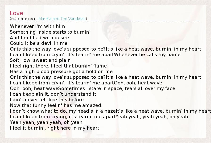 Whenever I'm with him Something inside starts to burnin' And I'm filled with desire Could it be a devil in me Or is this the way love's supposed to be?It's like a heat wave, burnin' in my heart I can't keep from cryin', it's tearin' me apartWhenever he calls my name Soft, low, sweet and plain I feel right there, I feel that burnin' flame Has a high blood pressure got a hold on me Or is this the way love's supposed to be?It's like a heat wave, burnin' in my heart I can't keep from cryin', it's tearin' me apartOoh, ooh, heat wave Ooh, ooh, heat waveSometimes I stare in space, tears all over my face I can't explain it, don't understand it I ain't never felt like this before Now that funny feelin' has me amazed I don't know what to do, my head's in a hazeIt's like a heat wave, burnin' in my heart I can't keep from crying, it's tearin' me apartYeah yeah, yeah yeah, oh yeah Yeah yeah, yeah yeah, oh yeah I feel it burnin', right here in my heart