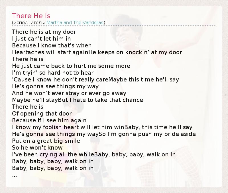 There he is at my door I just can't let him in Because I know that's when Heartaches will start againHe keeps on knockin' at my door There he is He just came back to hurt me some more I'm tryin' so hard not to hear 'Cause I know he don't really careMaybe this time he'll say He's gonna see things my way And he won't ever stray or ever go away Maybe he'll stayBut I hate to take that chance There he is Of opening that door Because if I see him again I know my foolish heart will let him winBaby, this time he'll say He's gonna see things my waySo I'm gonna push my pride aside Put on a great big smile So he won't know I've been crying all the whileBaby, baby, baby, walk on in Baby, baby, baby, walk on in Baby, baby, baby, walk on in ...