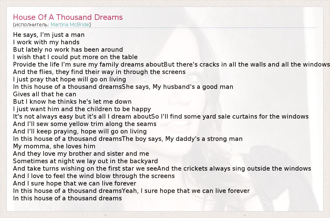 He says, I'm just a man I work with my hands But lately no work has been around I wish that I could put more on the table Provide the life I'm sure my family dreams aboutBut there's cracks in all the walls and all the windows And the flies, they find their way in through the screens I just pray that hope will go on living In this house of a thousand dreamsShe says, My husband's a good man Gives all that he can But I know he thinks he's let me down I just want him and the children to be happy It's not always easy but it's all I dream aboutSo I'll find some yard sale curtains for the windows And I'll sew some yellow trim along the seams And I'll keep praying, hope will go on living In this house of a thousand dreamsThe boy says, My daddy's a strong man My momma, she loves him And they love my brother and sister and me Sometimes at night we lay out in the backyard And take turns wishing on the first star we seeAnd the crickets always sing outside the windows And I love to feel the wind blow through the screens And I sure hope that we can live forever In this house of a thousand dreamsYeah, I sure hope that we can live forever In this house of a thousand dreams