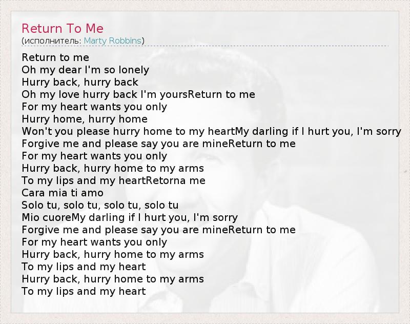 Return to me Oh my dear I'm so lonely Hurry back, hurry back Oh my love hurry back I'm yoursReturn to me For my heart wants you only Hurry home, hurry home Won't you please hurry home to my heartMy darling if I hurt you, I'm sorry Forgive me and please say you are mineReturn to me For my heart wants you only Hurry back, hurry home to my arms To my lips and my heartRetorna me Cara mia ti amo Solo tu, solo tu, solo tu, solo tu Mio cuoreMy darling if I hurt you, I'm sorry Forgive me and please say you are mineReturn to me For my heart wants you only Hurry back, hurry home to my arms To my lips and my heart Hurry back, hurry home to my arms To my lips and my heart