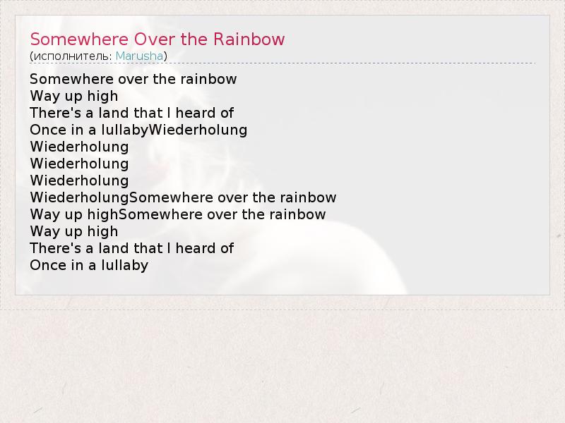 Somewhere over the rainbow Way up high There's a land that I heard of Once in a lullabyWiederholung Wiederholung Wiederholung Wiederholung WiederholungSomewhere over the rainbow Way up highSomewhere over the rainbow Way up high There's a land that I heard of Once in a lullaby