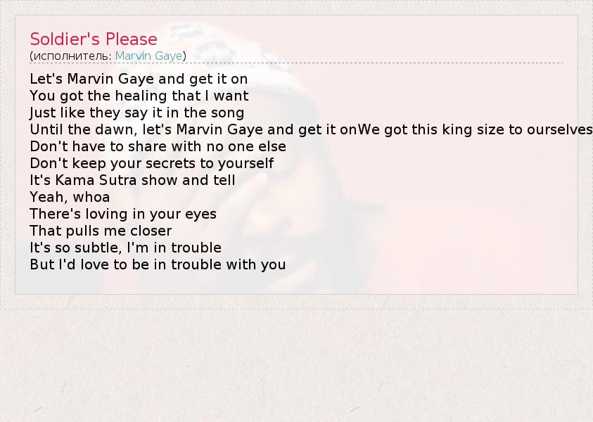 Это интересно:Марвин Гэй (Marvin Pentz Gaye) родился в 1939 году в Вашингтоне в семье христиан. С трёх лет пел в церковном хоре, потом подростком учился играть на органе. К 15-ти годам освоил клавишные и ударные и выступал с различными уличными негритянскими группами, в том числе "The Rainbows" и "Moonglows", игравшими в стиле "ритм-энд-блюз". В 1957 году присоединился к группе "Marquees", которая исполняла романтичные... продолжение