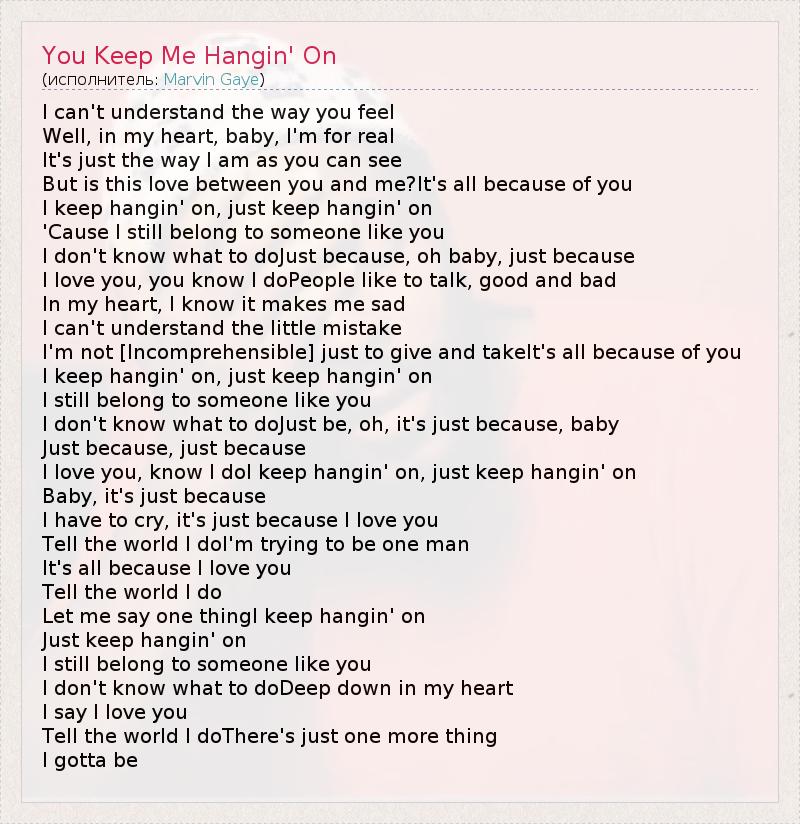 I love you, know I doI keep hangin' on, just keep hangin' on