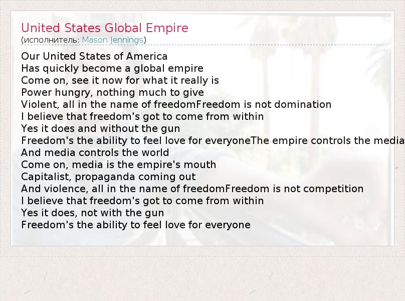 А как ты думаешь, о чем песня "United States Global Empire" ?