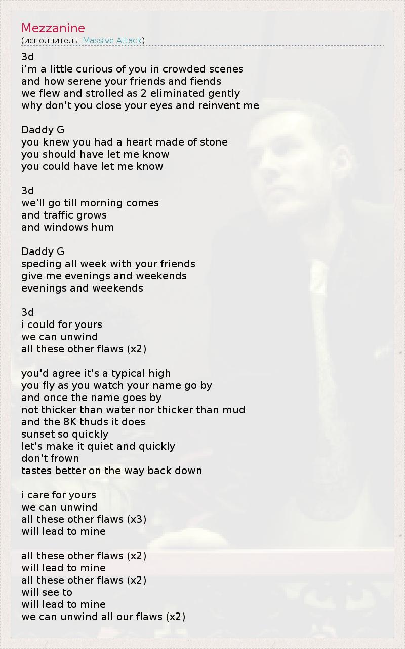 3d i'm a little curious of you in crowded scenes and how serene your friends and fiends we flew and strolled as 2 eliminated gently why don't you close your eyes and reinvent me Daddy G you knew you had a heart made of stone you should have let me know you could have let me know 3d we'll go till morning comes and traffic grows and windows hum Daddy G speding all week with your friends give me evenings and weekends evenings and weekends 3d i could for yours we can unwind all these other flaws (x2) you'd agree it's a typical high you fly as you watch your name go by and once the name goes by not thicker than water nor thicker than mud and the 8K thuds it does sunset so quickly let's make it quiet and quickly don't frown tastes better on the way back down i care for yours we can unwind all these other flaws (x3) will lead to mine all these other flaws (x2) will lead to mine all these other flaws (x2) will see to will lead to mine we can unwind all our flaws (x2)