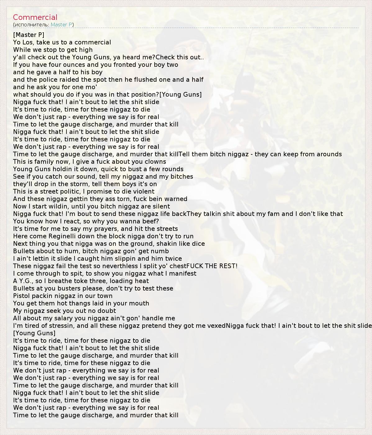 Time to let the gauge discharge, and murder that killTell them bitch niggaz - they can keep from arounds