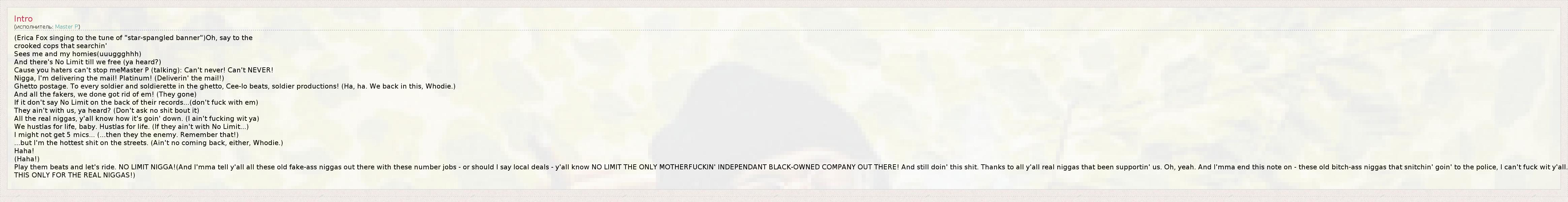 Play them beats and let's ride. NO LIMIT NIGGA!(And I'mma tell y'all all these old fake-ass niggas out there with these number jobs - or should I say local deals - y'all know NO LIMIT THE ONLY MOTHERFUCKIN' INDEPENDANT BLACK-OWNED COMPANY OUT THERE! And still doin' this shit. Thanks to all y'all real niggas that been supportin' us. Oh, yeah. And I'mma end this note on - these old bitch-ass niggas that snitchin' goin' to the police, I can't fuck wit y'all.