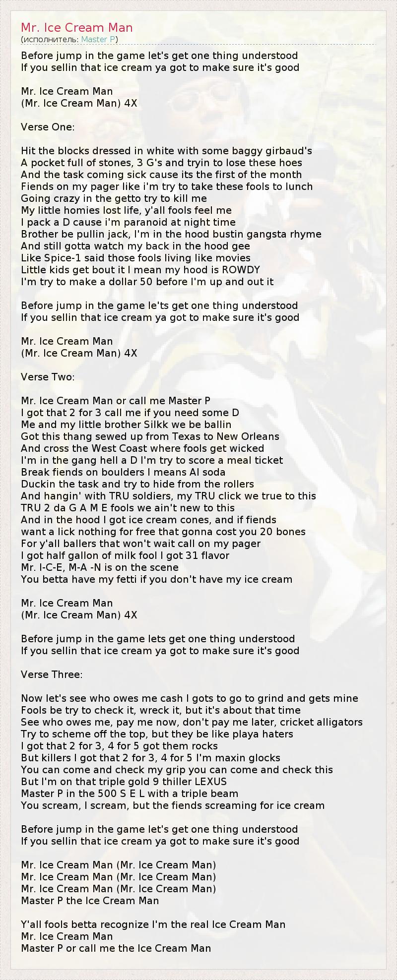Before jump in the game let's get one thing understood If you sellin that ice cream ya got to make sure it's good Mr. Ice Cream Man (Mr. Ice Cream Man) 4X Verse One: Hit the blocks dressed in white with some baggy girbaud's A pocket full of stones, 3 G's and tryin to lose these hoes And the task coming sick cause its the first of the month Fiends on my pager like i'm try to take these fools to lunch Going crazy in the getto try to kill me My little homies lost life, y'all fools feel me I pack a D cause i'm paranoid at night time Brother be pullin jack, I'm in the hood bustin gangsta rhyme And still gotta watch my back in the hood gee Like Spice-1 said those fools living like movies Little kids get bout it I mean my hood is ROWDY I'm try to make a dollar 50 before I'm up and out it Before jump in the game le'ts get one thing understood If you sellin that ice cream ya got to make sure it's good Mr. Ice Cream Man (Mr. Ice Cream Man) 4X Verse Two: Mr. Ice Cream Man or call me Master P I got that 2 for 3 call me if you need some D Me and my little brother Silkk we be ballin Got this thang sewed up from Texas to New Orleans And cross the West Coast where fools get wicked I'm in the gang hell a D I'm try to score a meal ticket Break fiends on boulders I means Al soda Duckin the task and try to hide from the rollers And hangin' with TRU soldiers, my TRU click we true to this TRU 2 da G A M E fools we ain't new to this And in the hood I got ice cream cones, and if fiends want a lick nothing for free that gonna cost you 20 bones For y'all ballers that won't wait call on my pager I got half gallon of milk fool I got 31 flavor Mr. I-C-E, M-A -N is on the scene You betta have my fetti if you don't have my ice cream Mr. Ice Cream Man (Mr. Ice Cream Man) 4X Before jump in the game lets get one thing understood If you sellin that ice cream ya got to make sure it's good Verse Three: Now let's see who owes me cash I gots to go to grind and gets mine Fools be try to check it, wreck it, but it's about that time See who owes me, pay me now, don't pay me later, cricket alligators Try to scheme off the top, but they be like playa haters I got that 2 for 3, 4 for 5 got them rocks But killers I got that 2 for 3, 4 for 5 I'm maxin glocks You can come and check my grip you can come and check this But I'm on that triple gold 9 thiller LEXUS Master P in the 500 S E L with a triple beam You scream, I scream, but the fiends screaming for ice cream Before jump in the game let's get one thing understood If you sellin that ice cream ya got to make sure it's good Mr. Ice Cream Man (Mr. Ice Cream Man) Mr. Ice Cream Man (Mr. Ice Cream Man) Mr. Ice Cream Man (Mr. Ice Cream Man) Master P the Ice Cream Man Y'all fools betta recognize I'm the real Ice Cream Man Mr. Ice Cream Man Master P or call me the Ice Cream Man