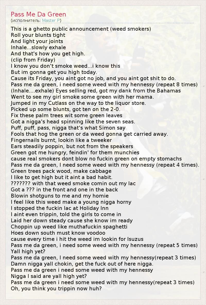 Pass me da green, i need some weed with my hennessy (repeat 8 times)