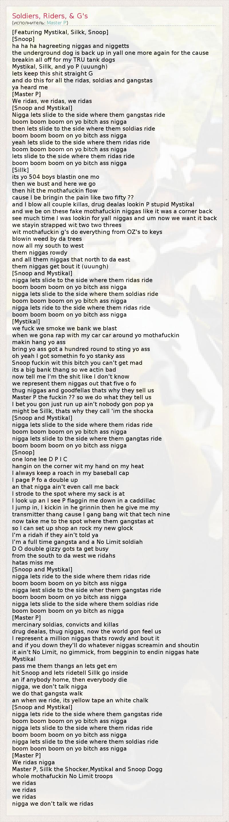 [Featuring Mystikal, Silkk, Snoop] [Snoop] ha ha ha hagreeting niggas and niggetts the underground dog is back up in yall one more again for the cause breakin all off for my TRU tank dogs Mystikal, Sillk, and yo P (uuungh) lets keep this shit straight G and do this for all the ridas, soldias and gangstas ya heard me [Master P] We ridas, we ridas, we ridas [Snoop and Mystikal] Nigga lets slide to the side where them gangstas ride boom boom boom on yo bitch ass nigga then lets slide to the side where them soldias ride boom boom boom on yo bitch ass nigga yeah lets slide to the side where them ridas ride boom boom boom on yo bitch ass nigga lets slide to the side where them ridas ride boom boom boom on yo bitch ass nigga [Sillk] its yo 504 boys blastin one mo then we bust and here we go then hit the mothafuckin flow cause I be bringin the pain like two fifty ?? and I blow all couple killas, drug dealas lookin P stupid Mystikal and we be on these fake mothafuckin niggas like it was a corner back see much time I was lookin for yall niggas and um now we want it back we stayin strapped wit two two threes wit mothafuckin g's do everything from OZ's to keys blowin weed by da trees now all my south to west them niggas rowdy and all them niggas that north to da east them niggas get bout it (uuungh) [Snoop and Mystikal] nigga lets slide to the side where them ridas ride boom boom boom on yo bitch ass nigga nigga lets slide to the side where them soldias ride boom boom boom on yo bitch ass nigga nigga lets ride to the side where them ridas ride boom boom boom on yo bitch ass nigga [Mystikal] we fuck we smoke we bank we blast when we gona rap with my car car around yo mothafuckin makin hang yo ass bring yo ass got a hundred round to sting yo ass oh yeah I got somethin fo yo stanky ass Snoop fuckin wit this bitch you can't get mad its a big bank thang so we actin bad now tell me I'm the shit like I don't know we represent them niggas out that five o fo thug niggas and goodfellas thats why they sell us Master P the fuckin ?? so we do what they tell us I bet you gon just run up ain't nobody gon pop ya might be Sillk, thats why they call 'im the shocka [Snoop and Mystikal] nigga lets slide to the side where them ridas ride boom boom boom on yo bitch ass nigga nigga lets slide to the side where them gangtas ride boom boom boom on yo bitch ass nigga [Snoop] one lone lee D P I C hangin on the corner wit my hand on my heat I always keep a roach in my baseball cap I page P fo a double up an that nigga ain't even call me back I strode to the spot where my sack is at I look up an I see P flaggin me down in a caddillac I jump in, I kickin in he grinnin then he give me my transmitter thang cause I gang bang wit that tech nine now take me to the spot where them gangstas at so I can set up shop an rock my new glock I'm a ridah if they ain't told ya I'm a full time gangsta and a No Limit soldiah D O double gizzy gots ta get busy from the south to da west we ridahs hatas miss me [Snoop and Mystikal] nigga lets ride to the side where them ridas ride boom boom boom on yo bitch ass nigga nigga lest slide to the side wher them gangstas ride boom boom boom on yo bitch ass nigga nigga lets slide to the side where them soldias ride boom boom boom on yo bitch as nigga [Master P] mercinary soldias, convicts and killas drug dealas, thug niggas, now the world gon feel us I represent a million niggas thats rowdy and bout it and if you down they'll do whatever niggas screamin and shoutin it ain't No Limit, no gimmick, from begginin to endin niggas hate Mystikal pass me them thangs an lets get em hit Snoop and lets ridetell Sillk go inside an if anybody home, then everybody die nigga, we don't talk nigga we do that gangsta walk an when we ride, its yellow tape an white chalk [Snoop and Mystikal] nigga lets ride to the side where them gangstas ride boom boom boom on yo bitch ass nigga nigga lets slide to the side where them ridas ride boom boom boom on yo bitch ass nigga nigga lets slide to the side where them soldias ride boom boom boom on yo bitch ass nigga [Master P] We ridas nigga Master P, Sillk the Shocker,Mystikal and Snoop Dogg whole mothafuckin No Limit troops we ridas we ridas we ridas nigga we don't talk we ridas