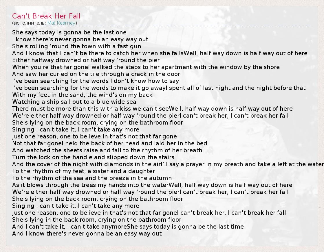 Just one reason, one to believe in that's not that far goneI can't break her, I can't break her fall