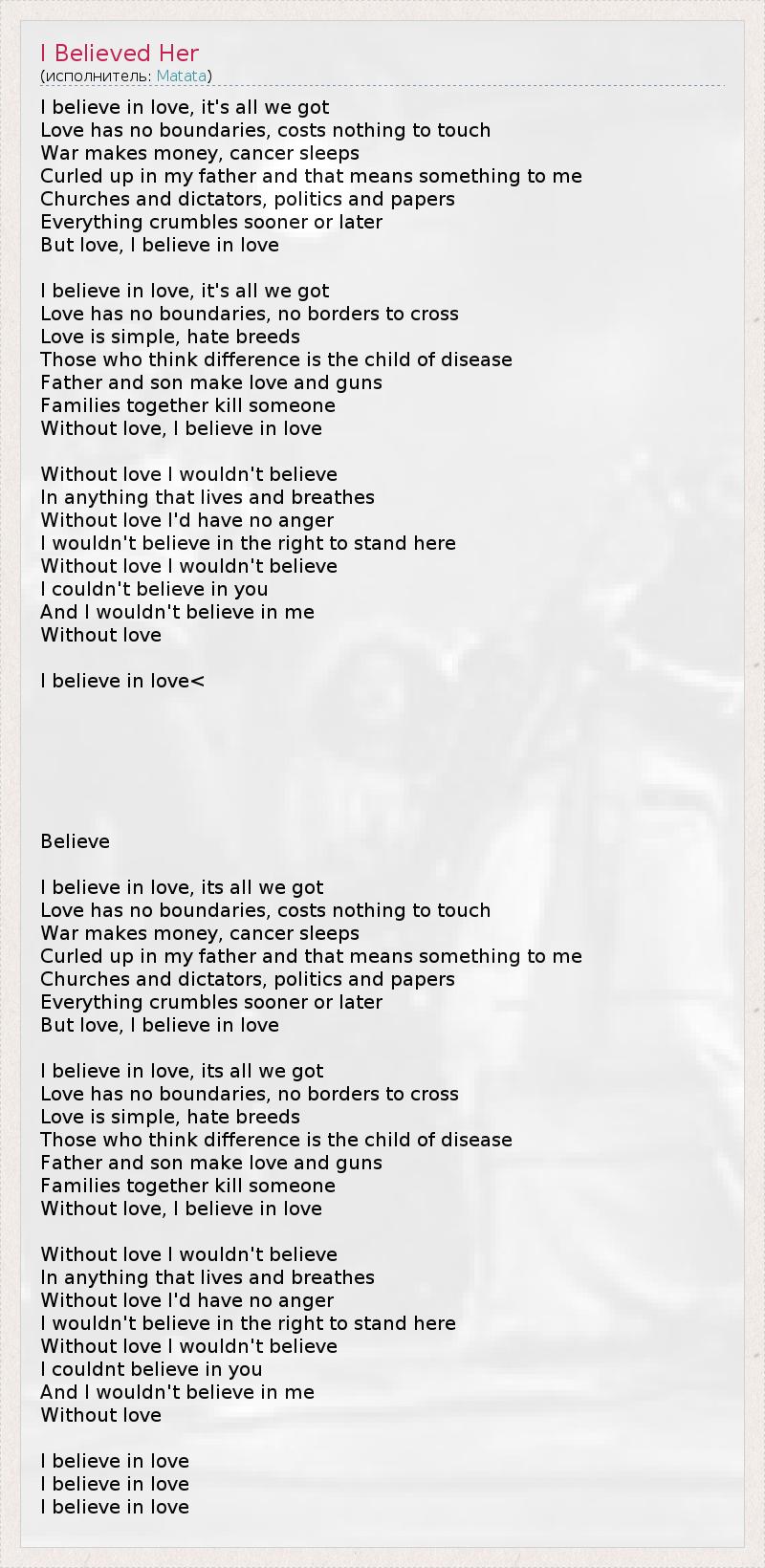 Верую в любовь – это все, что есть. Ей нет пределов, затрат – не счесть. Войны плодят деньги, рак в отце Спит, змеей свернулся, и я меняюсь в лице. Церкви и тираны, СМИ, политиканы Рано иль поздно в прошлое канут, Но не любовь. Верую в любовь. Верую в любовь – это все, что есть. Преград, пределов не встретишь здесь. Любовь – проста, вражды хотят Те, кто счел разность за порока дитя. Отцы и сыны делят ложе войны, Семьи в единеньи льют чью-то кровь Без любви. Верую в любовь. Не будь любви – не верить мне Во все, что дышит и живет. Не будь любви – не мыслим гнев, Нет права находиться здесь. Не будь любви – не верить мне... Не мог бы верить я в тебя, Не мог бы верить я в себя – Не будь любви. Верую в любовь. * поэтический (эквиритмический) перевод Верю (перевод lavagirl) Я верю в любовь, это все, что у нас есть. Любовь безгранична и бесценна, Война приносит деньги, рак спит, Свернувшись клубочком в теле моего отца, и это что-то значит для меня. Церкви и диктаторы, политики и газеты - Все это рухнет рано или поздно, Но не любовь, я верю в любовь... Я верю в любовь, это все, что у нас есть, Любовь безгранична, ее не измерить. Любовь проста, это ненависть порождает Тех, кто думает, что различие - это дитя болезни... Отец и сын создают любовь и ружья, Семьи вместе убивают кого-то, Без любви... Я верю в любовь... Без любви я бы не верил Во все, что живет и дышит. Без любви не было бы гнева, Я бы не верил в право стоять здесь, Без любви я бы не верил, Не мог бы поверить в тебя, Не верил бы в себя, Без любви... Я верю в любовь... Я верю в любовь... Я верю в любовь...