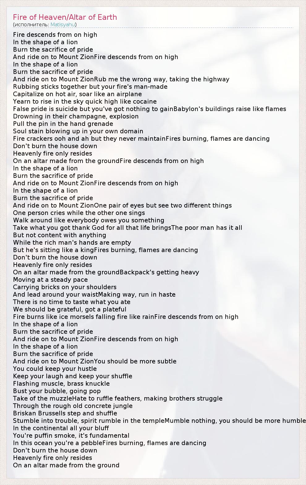 ГлавнаяИсполнителиMatisyahuFire of Heaven/Altar of Earth