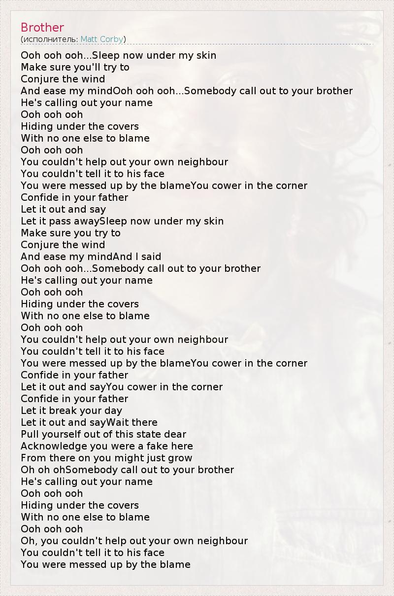 And ease my mindOoh ooh ooh...Somebody call out to your brother