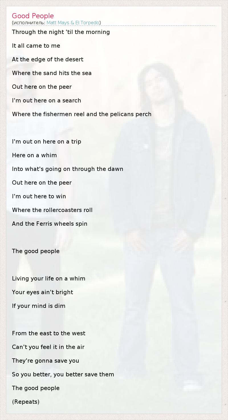 Through the night 'til the morning It all came to me At the edge of the desert Where the sand hits the sea Out here on the peer I'm out here on a search Where the fishermen reel and the pelicans perch I'm out on here on a trip Here on a whim Into what's going on through the dawn Out here on the peer I'm out here to win Where the rollercoasters roll And the Ferris wheels spin The good people Living your life on a whim Your eyes ain't bright If your mind is dim From the east to the west Can't you feel it in the air They're gonna save you So you better, you better save them The good people (Repeats)