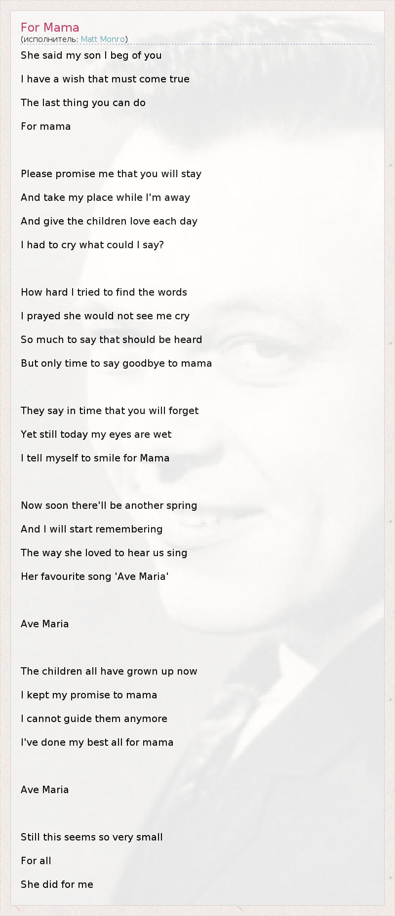 She said my son I beg of you I have a wish that must come true The last thing you can do For mama Please promise me that you will stay And take my place while I'm away And give the children love each day I had to cry what could I say? How hard I tried to find the words I prayed she would not see me cry So much to say that should be heard But only time to say goodbye to mama They say in time that you will forget Yet still today my eyes are wet I tell myself to smile for Mama Now soon there'll be another spring And I will start remembering The way she loved to hear us sing Her favourite song 'Ave Maria' Ave Maria The children all have grown up now I kept my promise to mama I cannot guide them anymore I've done my best all for mama Ave Maria Still this seems so very small For all She did for me