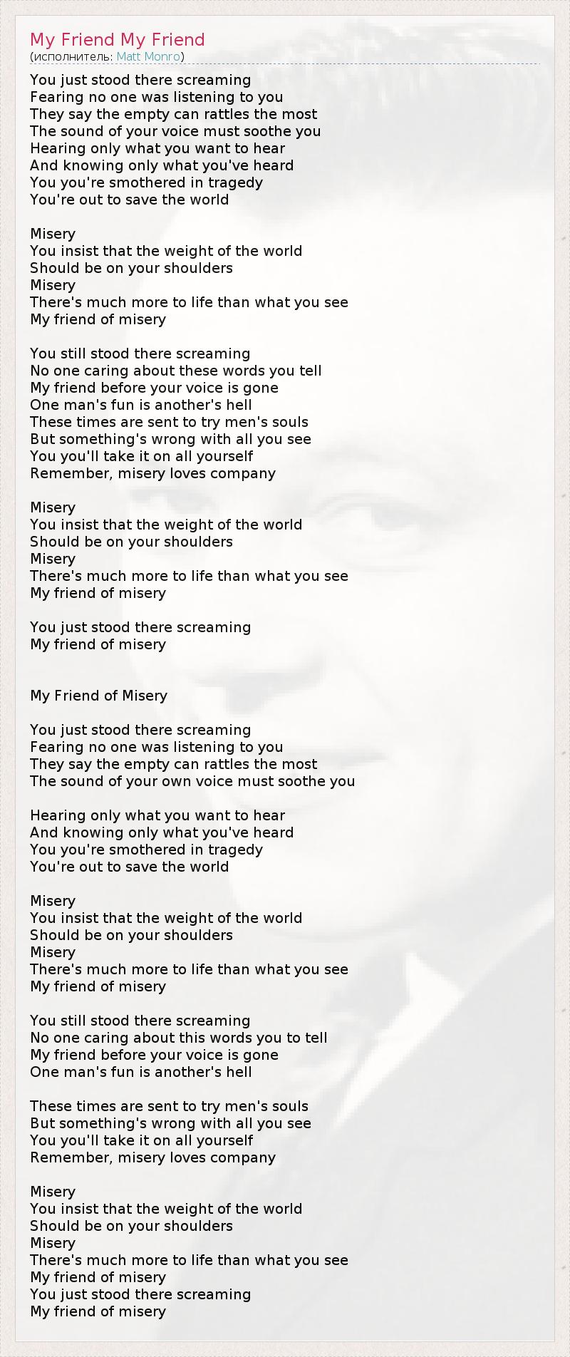 Ты стоял там и громко вопил, Боясь, что никто тебя не слушает. Говорят, пустые банки гремят громче остальных, Звук твоего собственного голоса, должно быть, тебя успокаивает. Ты слышишь лишь то, что хочешь слышать, И понимаешь лишь то, что услышал. Тебя душат трагедии, И ты идёшь спасать мир. Страдание, Ты настаиваешь на том, чтобы тяжесть мира Лежала на твоих плечах. Страдание, Жизнь - нечто большее, чем тебе представляется, Мой друг страдания. Ты продолжал там стоять и громко вопить, Но всем плевать на эти твои слова. Друг мой, пока ты не лишился голоса: Забава для одного - для другого ад! Эти времена ниспосланы для испытания человеческих душ, Но со всем, что ты видишь, что-то не так. Ты примешь вызов в одиночестве, Помни, страдание любит компанию. Страдание, Ты настаиваешь на том, чтобы тяжесть мира Лежала на твоих плечах. Страдание, Жизнь - нечто большее, чем тебе представляется, Мой друг страдания. Ты просто стоял там и громко вопил, Мой друг страдания... Мой друг страдания* (перевод Данил Brushma Потешкин из Дзержинска) Ты просто стоял и жалел себя сам, Но разве кого-нибудь тронул твой плач? Рыданье - тебе же на душу бальзам, На горы обид ты жалел горы сдач. Ты всё уясняешь на собственный лад И знаешь лишь то, что твой слух уловил. Ты будто бы личной трагедии рад. Тебе ли спасать погибающий мир? Страдание! Говоришь, что лежит на плечах Твоих мироздание. Правда ли? Жизнь не одни лишь слова, Мой друг страдания! А ты все стоял и орал ерунду, И все равнодушно прошли стороной. Мой друг, то, что в радость и смех одному, Другому покажется адской игрой. Настала пора испытания душ, Но все ли идет, как должно бы, мой друг? Чтоб горю предаться, довольно ты дюж - Прими же несчастье, не медля, в свой круг. Страдание! Говоришь, что лежит на плечах Твоих мироздание. Правда ли? Жизнь не одни лишь слова, Мой друг страдания! Ты просто стоял там, крича, Мой друг страдания! * поэтический перевод с элементами творческой интерпретации