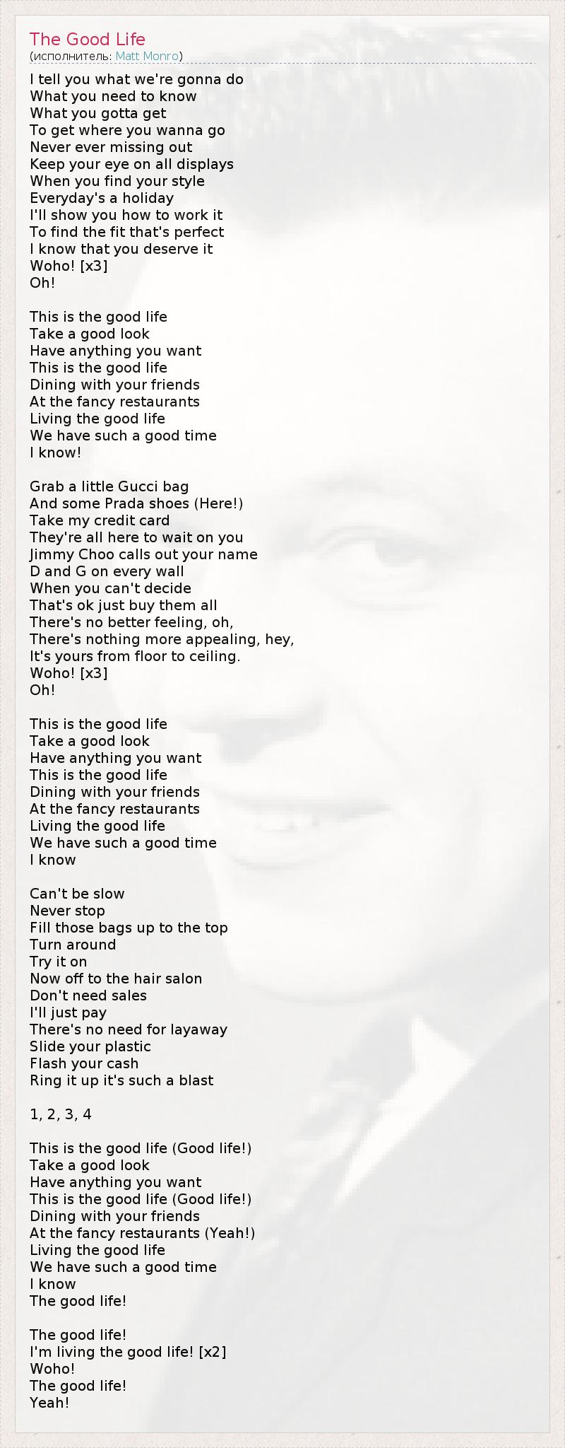 I tell you what we're gonna do What you need to know What you gotta get To get where you wanna go Never ever missing out Keep your eye on all displays When you find your style Everyday's a holiday I'll show you how to work it To find the fit that's perfect I know that you deserve it Woho! [x3] Oh! This is the good life Take a good look Have anything you want This is the good life Dining with your friends At the fancy restaurants Living the good life We have such a good time I know! Grab a little Gucci bag And some Prada shoes (Here!) Take my credit card They're all here to wait on you Jimmy Choo calls out your name D and G on every wall When you can't decide That's ok just buy them all There's no better feeling, oh, There's nothing more appealing, hey, It's yours from floor to ceiling. Woho! [x3] Oh! This is the good life Take a good look Have anything you want This is the good life Dining with your friends At the fancy restaurants Living the good life We have such a good time I know Can't be slow Never stop Fill those bags up to the top Turn around Try it on Now off to the hair salon Don't need sales I'll just pay There's no need for layaway Slide your plastic Flash your cash Ring it up it's such a blast 1, 2, 3, 4 This is the good life (Good life!) Take a good look Have anything you want This is the good life (Good life!) Dining with your friends At the fancy restaurants (Yeah!) Living the good life We have such a good time I know The good life! The good life! I'm living the good life! [x2] Woho! The good life! Yeah!