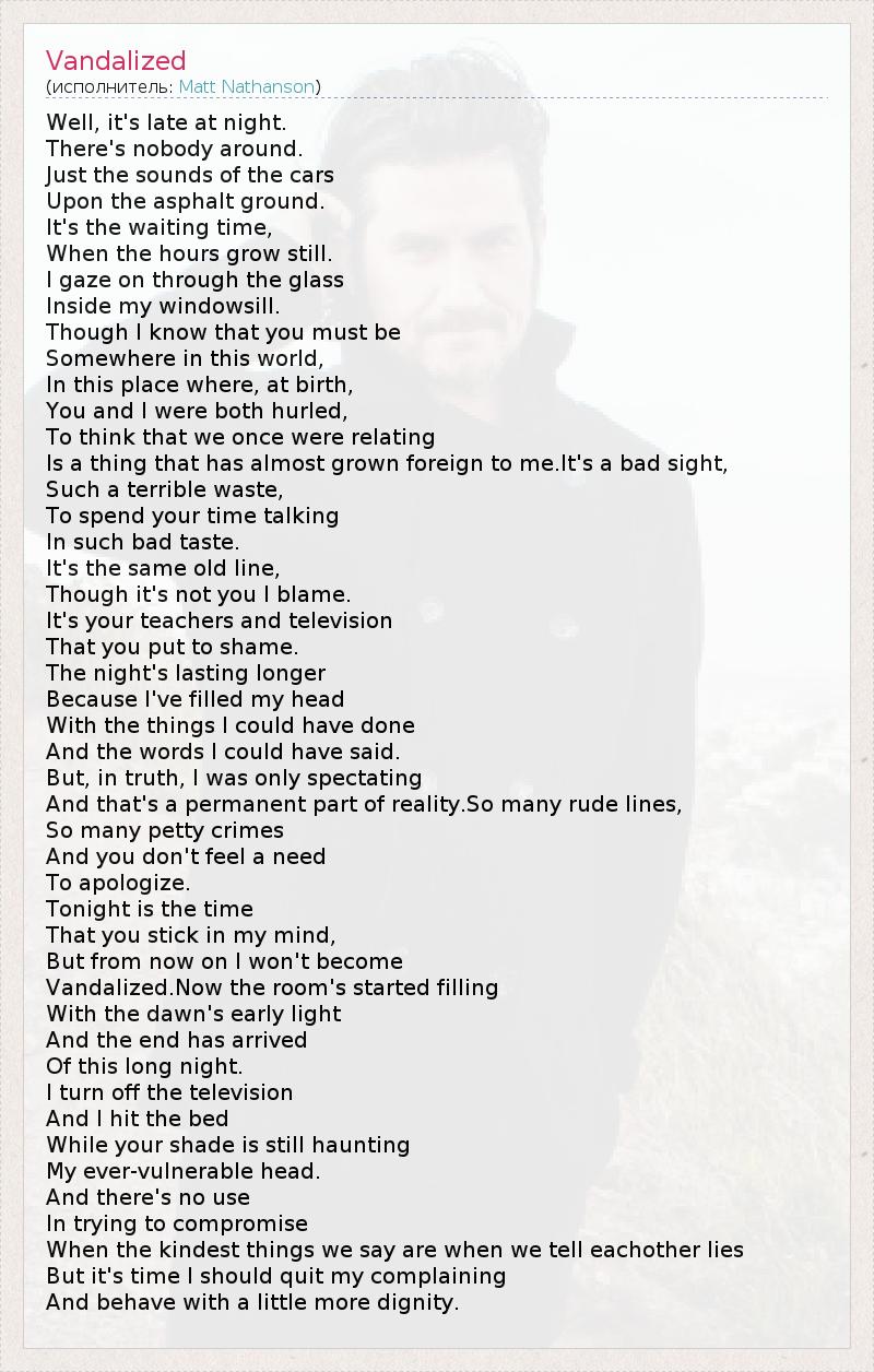Это интересно:Matt Nathanson (born March 28, 1973 in Lexington, Massachusetts) is an American singer-songwriter whose work is a blend of folk and rock music. In addition to singing, he plays acoustic (usually a twelve-string) and electric guitar, and has played both solo and with a full band. He is perhaps best known for his platinum-selling song "Come On Get Higher", as well as his comedic personality.Studio albums * 1993: Please * 1997: ERNST * 1998: Not Colored Too Perfect * 1999: Still Waiting for Spring * 2003: Beneath These Fireworks * 2007: Some Mad Hope Live albums * 2006: At the Point EPs * 2002: When... продолжение