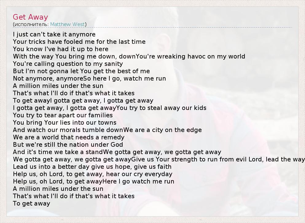 I just can't take it anymore Your tricks have fooled me for the last time You know I've had it up to here With the way You bring me down, downYou're wreaking havoc on my world You're calling question to my sanity But I'm not gonna let You get the best of me Not anymore, anymoreSo here I go, watch me run A million miles under the sun That's what I'll do if that's what it takes To get awayI gotta get away, I gotta get away I gotta get away, I gotta get awayYou try to steal away our kids You try to tear apart our families You bring Your lies into our towns And watch our morals tumble downWe are a city on the edge We are a world that needs a remedy But we're still the nation under God And it's time we take a standWe gotta get away, we gotta get away We gotta get away, we gotta get awayGive us Your strength to run from evil Lord, lead the way Lead us into a better day give us hope, give us faith Help us, oh Lord, to get away, hear our cry everyday Help us, oh Lord, to get awayHere I go watch me run A million miles under the sun That's what I'll do if that's what it takes To get away