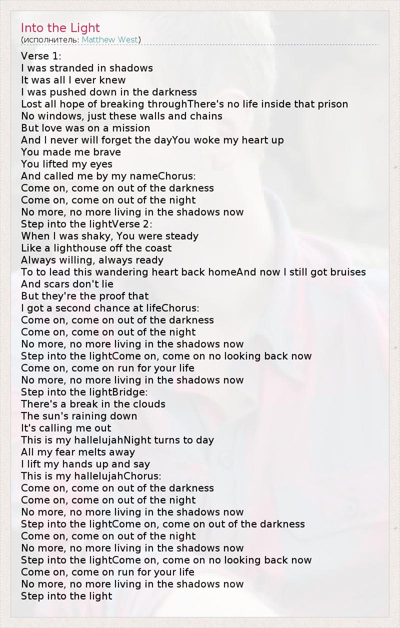 Step into the lightCome on, come on out of the darkness