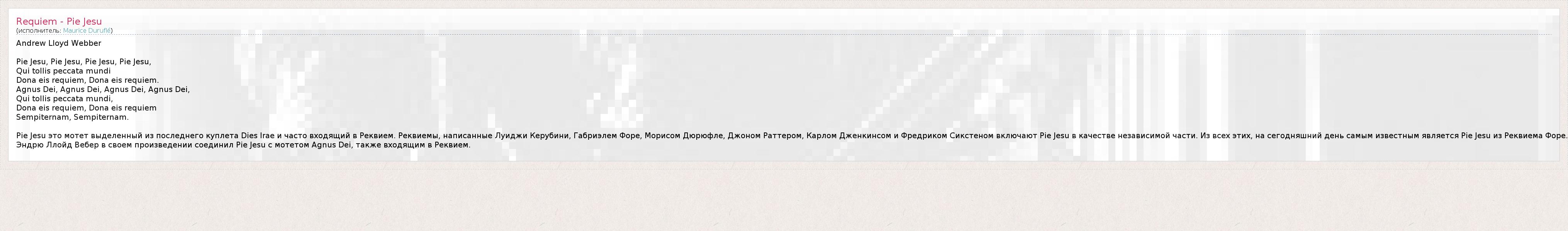 Andrew Lloyd Weber in his work connected with the motet Pie Jesu Agnus Dei, is also included in the Requiem.
