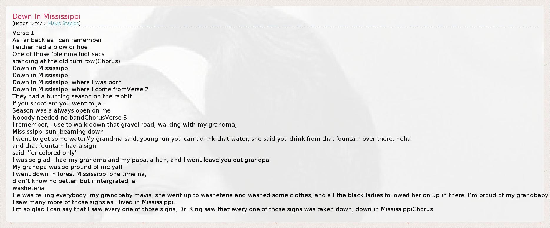 Verse 1 As far back as I can remember I either had a plow or hoe One of those 'ole nine foot sacs standing at the old turn row(Chorus) Down in Mississippi Down in Mississippi Down in Mississippi where I was born Down in Mississippi where i come fromVerse 2 They had a hunting season on the rabbit If you shoot em you went to jail Season was a always open on me Nobody needed no bandChorusVerse 3 I remember, I use to walk down that gravel road, walking with my grandma, Mississippi sun, beaming down I went to get some waterMy grandma said, young 'un you can't drink that water, she said you drink from that fountain over there, heha and that fountain had a sign said "for colored only" I was so glad I had my grandma and my papa, a huh, and I wont leave you out grandpa My grandpa was so pround of me yall I went down in forest Mississippi one time na, didn't know no better, but i intergrated, a washeteria He was telling everybody, my grandbaby mavis, she went up to washeteria and washed some clothes, and all the black ladies followed her on up in there, I'm proud of my grandbaby, I saw many more of those signs as I lived in Mississippi, I'm so glad I can say that I saw every one of those signs, Dr. King saw that every one of those signs was taken down, down in MississippiChorus