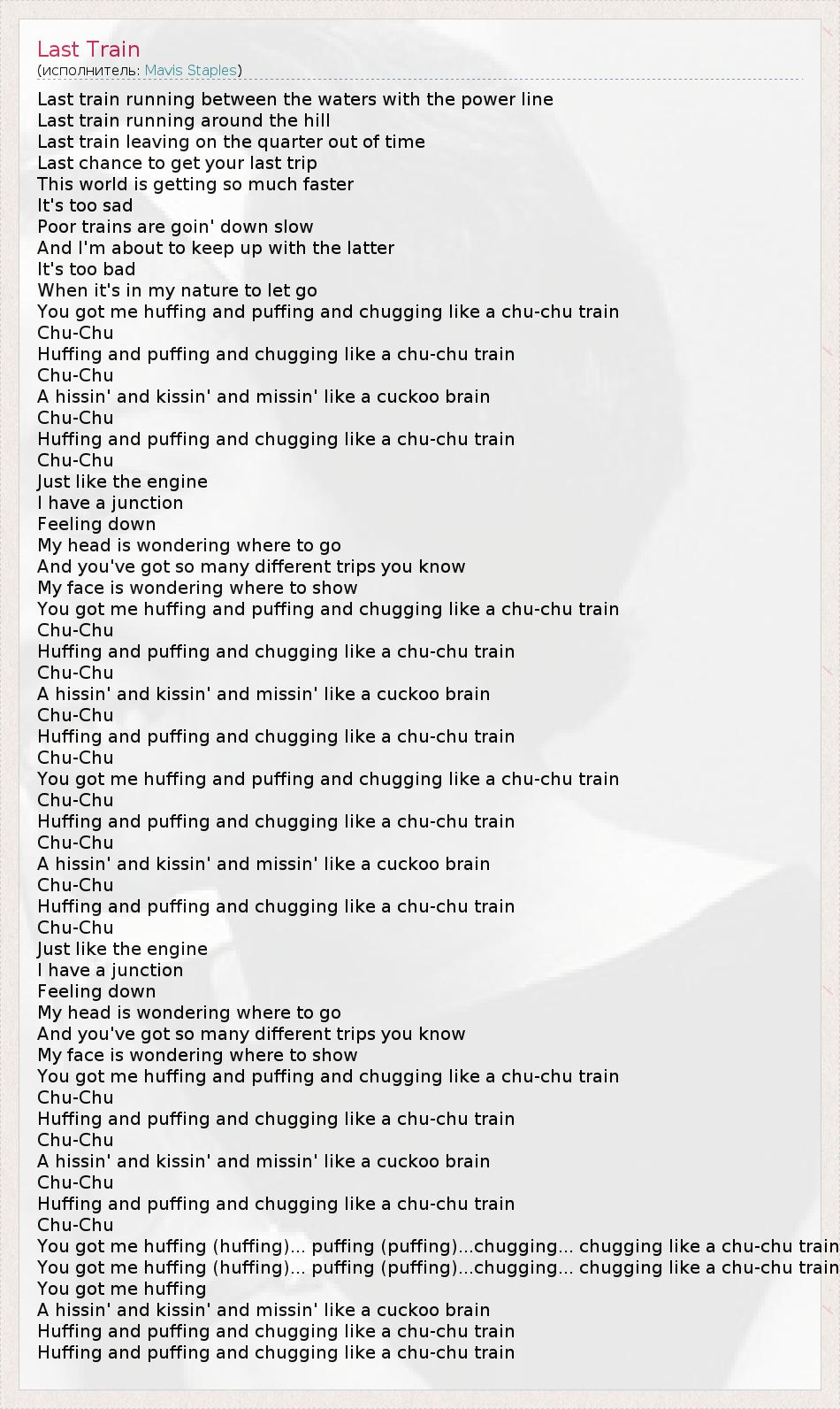 Last train running between the waters with the power line Last train running around the hill Last train leaving on the quarter out of time Last chance to get your last trip This world is getting so much faster It's too sad Poor trains are goin' down slow And I'm about to keep up with the latter It's too bad When it's in my nature to let go You got me huffing and puffing and chugging like a chu-chu train Chu-Chu Huffing and puffing and chugging like a chu-chu train Chu-Chu A hissin' and kissin' and missin' like a cuckoo brain Chu-Chu Huffing and puffing and chugging like a chu-chu train Chu-Chu Just like the engine I have a junction Feeling down My head is wondering where to go And you've got so many different trips you know My face is wondering where to show You got me huffing and puffing and chugging like a chu-chu train Chu-Chu Huffing and puffing and chugging like a chu-chu train Chu-Chu A hissin' and kissin' and missin' like a cuckoo brain Chu-Chu Huffing and puffing and chugging like a chu-chu train Chu-Chu You got me huffing and puffing and chugging like a chu-chu train Chu-Chu Huffing and puffing and chugging like a chu-chu train Chu-Chu A hissin' and kissin' and missin' like a cuckoo brain Chu-Chu Huffing and puffing and chugging like a chu-chu train Chu-Chu Just like the engine I have a junction Feeling down My head is wondering where to go And you've got so many different trips you know My face is wondering where to show You got me huffing and puffing and chugging like a chu-chu train Chu-Chu Huffing and puffing and chugging like a chu-chu train Chu-Chu A hissin' and kissin' and missin' like a cuckoo brain Chu-Chu Huffing and puffing and chugging like a chu-chu train Chu-Chu You got me huffing (huffing)... puffing (puffing)...chugging... chugging like a chu-chu train You got me huffing (huffing)... puffing (puffing)...chugging... chugging like a chu-chu train You got me huffing A hissin' and kissin' and missin' like a cuckoo brain Huffing and puffing and chugging like a chu-chu train Huffing and puffing and chugging like a chu-chu train