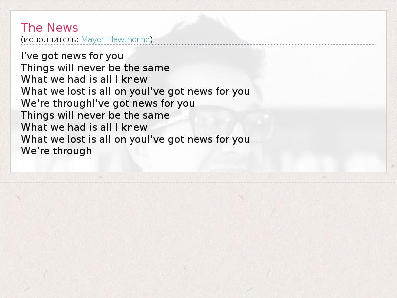 Это интересно:Мейер Хоуторн (р. 2 февраля 1979) родом из городка Энн-Арбор, пригорода Детройта. Мейер вырос на джазе и пластинках Motown, а среди своих кумиров называет Барри Уайта, Лероя Хатсона, Майка Терри, Айзека Хейза, и особенно Смоки Робинсона, Кертиса Мэйфилда и трио Ламона Дозье и братьев Холланд.До начала своей сольной карьеры Мейер выступал крунером в группах Athletic Mic League... продолжение