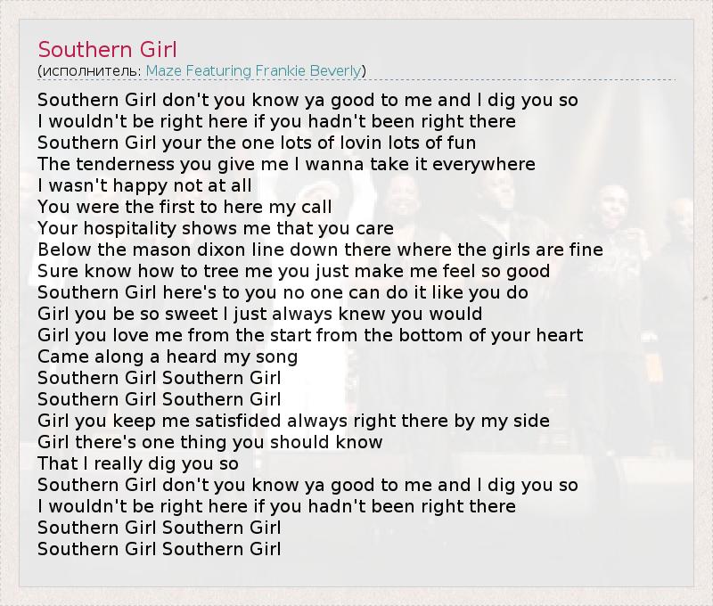 Southern Girl don't you know ya good to me and I dig you so I wouldn't be right here if you hadn't been right there Southern Girl your the one lots of lovin lots of fun The tenderness you give me I wanna take it everywhere I wasn't happy not at all You were the first to here my call Your hospitality shows me that you care Below the mason dixon line down there where the girls are fine Sure know how to tree me you just make me feel so good Southern Girl here's to you no one can do it like you do Girl you be so sweet I just always knew you would Girl you love me from the start from the bottom of your heart Came along a heard my song Southern Girl Southern Girl Southern Girl Southern Girl Girl you keep me satisfided always right there by my side Girl there's one thing you should know That I really dig you so Southern Girl don't you know ya good to me and I dig you so I wouldn't be right here if you hadn't been right there Southern Girl Southern Girl Southern Girl Southern Girl
