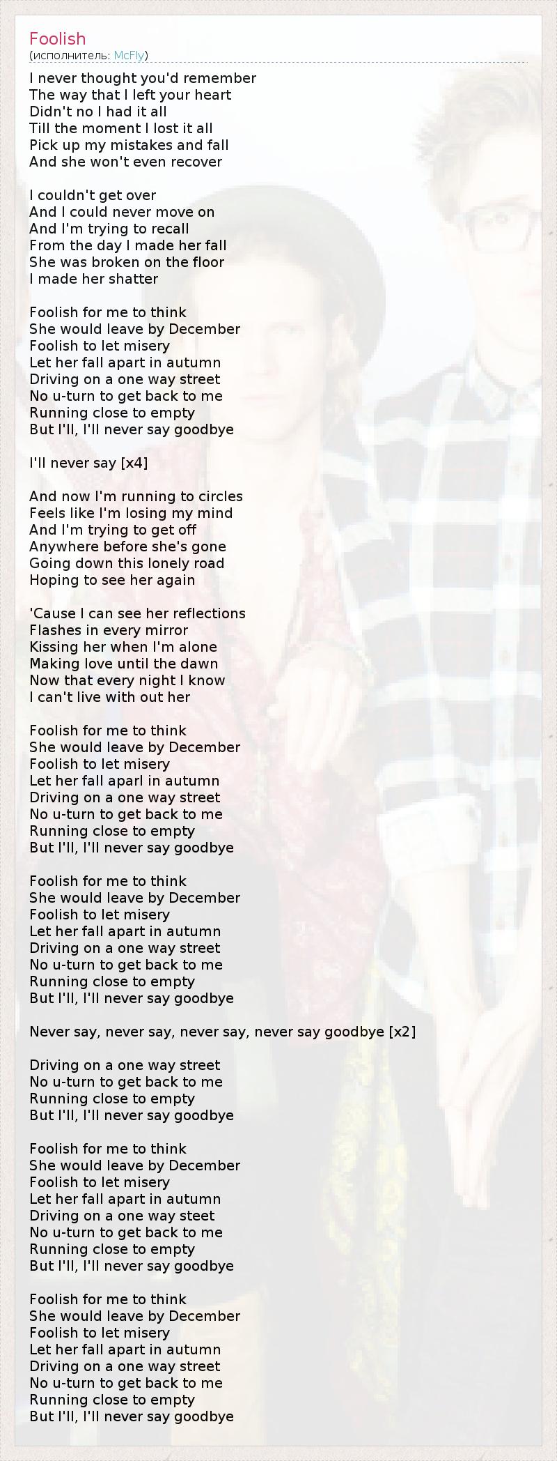 I never thought you'd remember The way that I left your heart Didn't no I had it all Till the moment I lost it all Pick up my mistakes and fall And she won't even recover I couldn't get over And I could never move on And I'm trying to recall From the day I made her fall She was broken on the floor I made her shatter Foolish for me to think She would leave by December Foolish to let misery Let her fall apart in autumn Driving on a one way street No u-turn to get back to me Running close to empty But I'll, I'll never say goodbye I'll never say [x4] And now I'm running to circles Feels like I'm losing my mind And I'm trying to get off Anywhere before she's gone Going down this lonely road Hoping to see her again 'Cause I can see her reflections Flashes in every mirror Kissing her when I'm alone Making love until the dawn Now that every night I know I can't live with out her Foolish for me to think She would leave by December Foolish to let misery Let her fall aparl in autumn Driving on a one way street No u-turn to get back to me Running close to empty But I'll, I'll never say goodbye Foolish for me to think She would leave by December Foolish to let misery Let her fall apart in autumn Driving on a one way street No u-turn to get back to me Running close to empty But I'll, I'll never say goodbye Never say, never say, never say, never say goodbye [x2] Driving on a one way street No u-turn to get back to me Running close to empty But I'll, I'll never say goodbye Foolish for me to think She would leave by December Foolish to let misery Let her fall apart in autumn Driving on a one way steet No u-turn to get back to me Running close to empty But I'll, I'll never say goodbye Foolish for me to think She would leave by December Foolish to let misery Let her fall apart in autumn Driving on a one way street No u-turn to get back to me Running close to empty But I'll, I'll never say goodbye