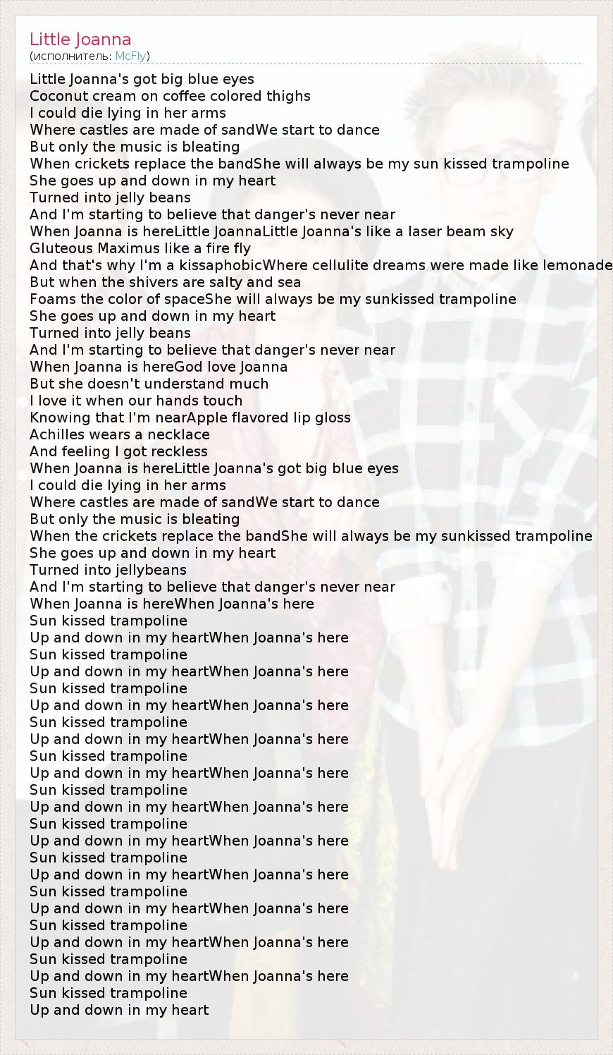 Little Joanna's got big blue eyes Coconut cream on coffee colored thighs I could die lying in her arms Where castles are made of sandWe start to dance But only the music is bleating When crickets replace the bandShe will always be my sun kissed trampoline She goes up and down in my heart Turned into jelly beans And I'm starting to believe that danger's never near When Joanna is hereLittle JoannaLittle Joanna's like a laser beam sky Gluteous Maximus like a fire fly And that's why I'm a kissaphobicWhere cellulite dreams were made like lemonade But when the shivers are salty and sea Foams the color of spaceShe will always be my sunkissed trampoline She goes up and down in my heart Turned into jelly beans And I'm starting to believe that danger's never near When Joanna is hereGod love Joanna But she doesn't understand much I love it when our hands touch Knowing that I'm nearApple flavored lip gloss Achilles wears a necklace And feeling I got reckless When Joanna is hereLittle Joanna's got big blue eyes I could die lying in her arms Where castles are made of sandWe start to dance But only the music is bleating When the crickets replace the bandShe will always be my sunkissed trampoline She goes up and down in my heart Turned into jellybeans And I'm starting to believe that danger's never near When Joanna is hereWhen Joanna's here Sun kissed trampoline Up and down in my heartWhen Joanna's here Sun kissed trampoline Up and down in my heartWhen Joanna's here Sun kissed trampoline Up and down in my heartWhen Joanna's here Sun kissed trampoline Up and down in my heartWhen Joanna's here Sun kissed trampoline Up and down in my heartWhen Joanna's here Sun kissed trampoline Up and down in my heartWhen Joanna's here Sun kissed trampoline Up and down in my heartWhen Joanna's here Sun kissed trampoline Up and down in my heartWhen Joanna's here Sun kissed trampoline Up and down in my heartWhen Joanna's here Sun kissed trampoline Up and down in my heartWhen Joanna's here Sun kissed trampoline Up and down in my heartWhen Joanna's here Sun kissed trampoline Up and down in my heart