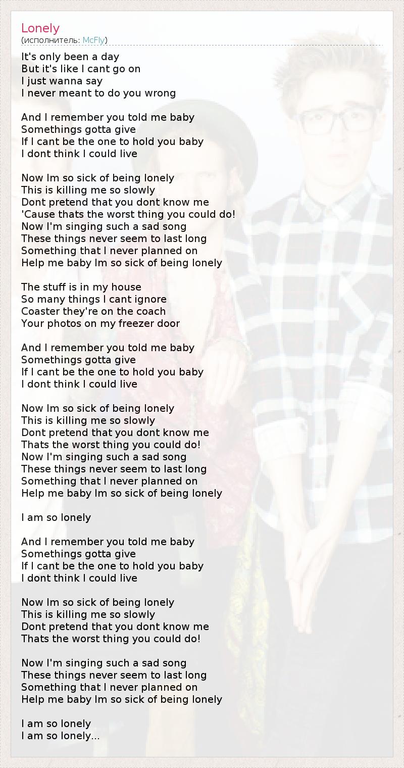 Одинокий (Lonely) Прошел всего лишь день, Но такое чувство, что я не могу жить дальше Я всего лишь хочу сказать, Что никогда не хотел сделать тебе плохо И я вспоминаю, что ты говорила мне "Что-то должно произойти" Если я не буду тем единственным, кто будет держать твою руку, Я не думаю, что смогу выжить Я так устал быть одиноким Это медленно меня убивает Не притворяйся, что не знаешь меня, Потому что это самое худшее, что ты можешь сделать Я пою эту грустную-грустную песню, Кажется, что ничто не вечно, Я никак этого не планировал, Помоги мне, детка, я так устал быть одиноким Все эти вещи в моем доме, Столько всего, чего я просто не могу игнорировать, Твое пальто до сих пор лежит на диване, Твои фотографии на двери моего холодильника. И я вспоминаю, что ты говорила мне “Что-то должно произойти” Если я не буду тем единственным, кто будет держать твою руку, Я не думаю, что смогу выжить [Припев:]