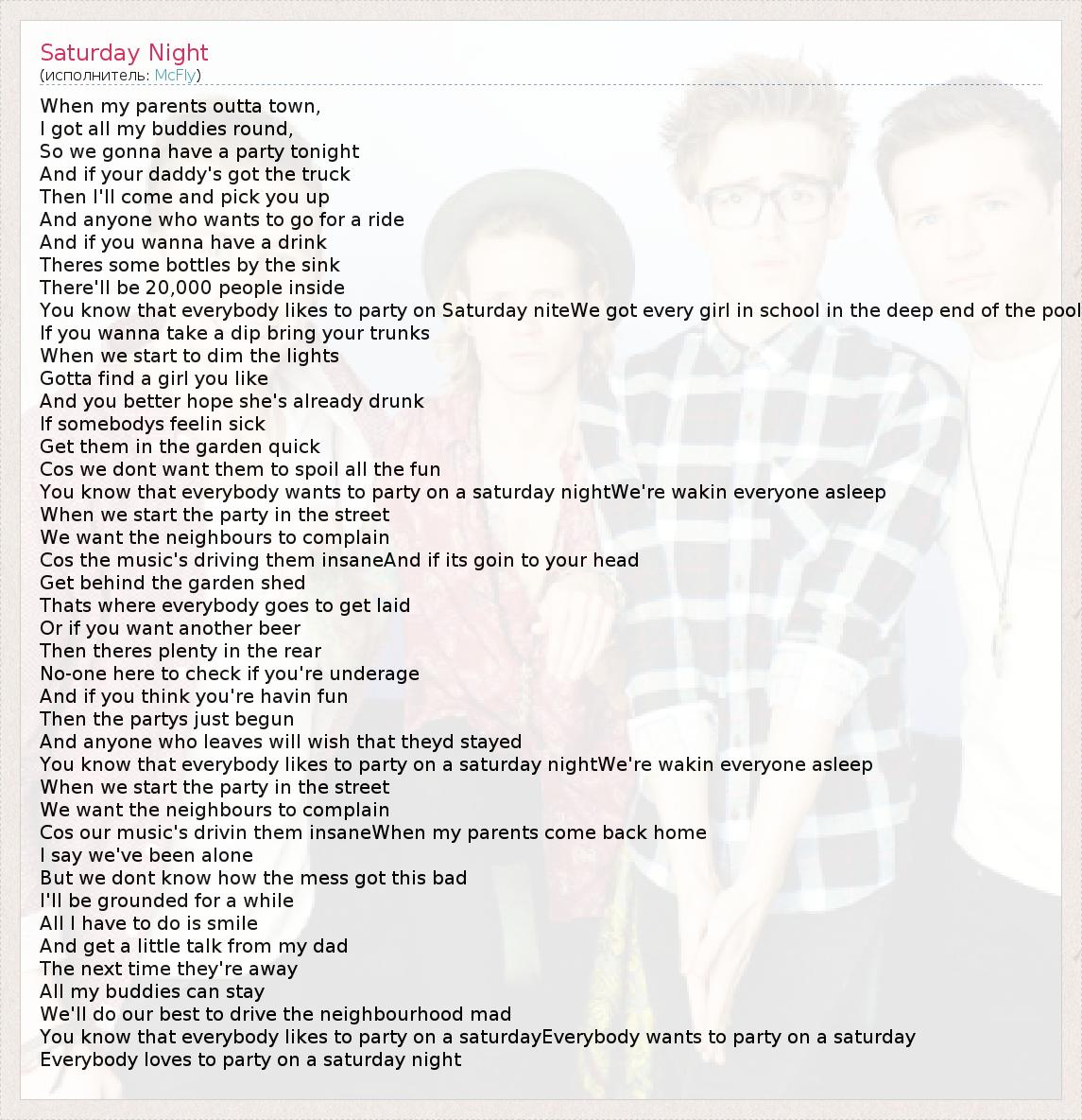 When my parents outta town, I got all my buddies round, So we gonna have a party tonight And if your daddy's got the truck Then I'll come and pick you up And anyone who wants to go for a ride And if you wanna have a drink Theres some bottles by the sink There'll be 20,000 people inside You know that everybody likes to party on Saturday niteWe got every girl in school in the deep end of the pool If you wanna take a dip bring your trunks When we start to dim the lights Gotta find a girl you like And you better hope she's already drunk If somebodys feelin sick Get them in the garden quick Cos we dont want them to spoil all the fun You know that everybody wants to party on a saturday nightWe're wakin everyone asleep When we start the party in the street We want the neighbours to complain Cos the music's driving them insaneAnd if its goin to your head Get behind the garden shed Thats where everybody goes to get laid Or if you want another beer Then theres plenty in the rear No-one here to check if you're underage And if you think you're havin fun Then the partys just begun And anyone who leaves will wish that theyd stayed You know that everybody likes to party on a saturday nightWe're wakin everyone asleep When we start the party in the street We want the neighbours to complain Cos our music's drivin them insaneWhen my parents come back home I say we've been alone But we dont know how the mess got this bad I'll be grounded for a while All I have to do is smile And get a little talk from my dad The next time they're away All my buddies can stay We'll do our best to drive the neighbourhood mad You know that everybody likes to party on a saturdayEverybody wants to party on a saturday Everybody loves to party on a saturday night