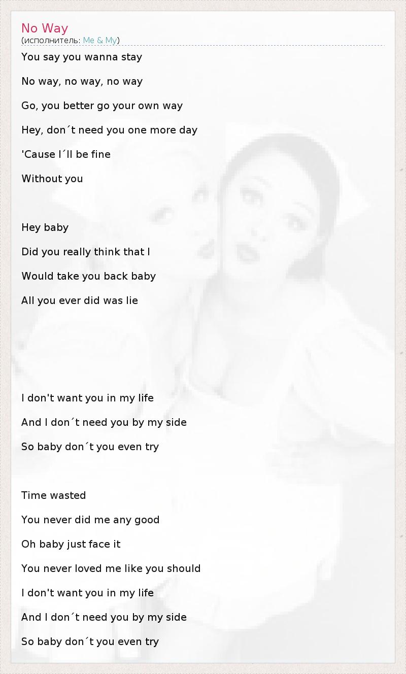 You say you wanna stay No way, no way, no way Go, you better go your own way Hey, don´t need you one more day 'Cause I´ll be fine Without you Hey baby Did you really think that I Would take you back baby All you ever did was lie I don't want you in my life And I don´t need you by my side So baby don´t you even try Time wasted You never did me any good Oh baby just face it You never loved me like you should I don't want you in my life And I don´t need you by my side So baby don´t you even try